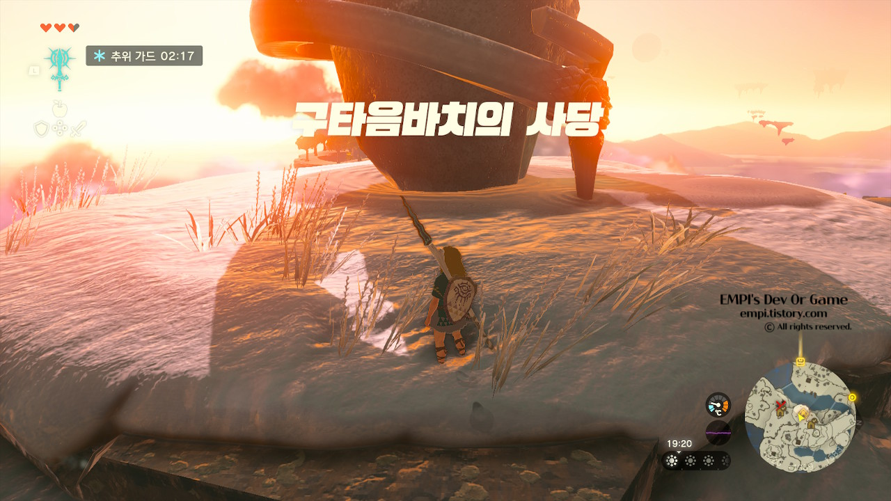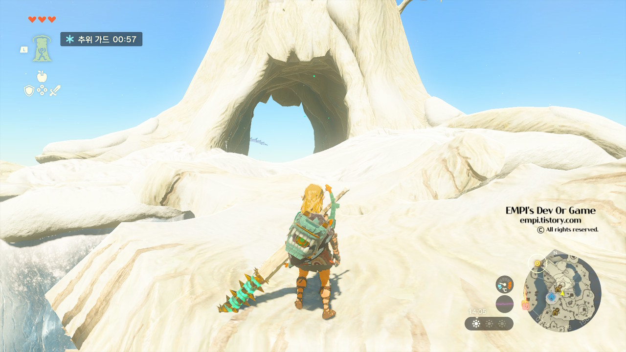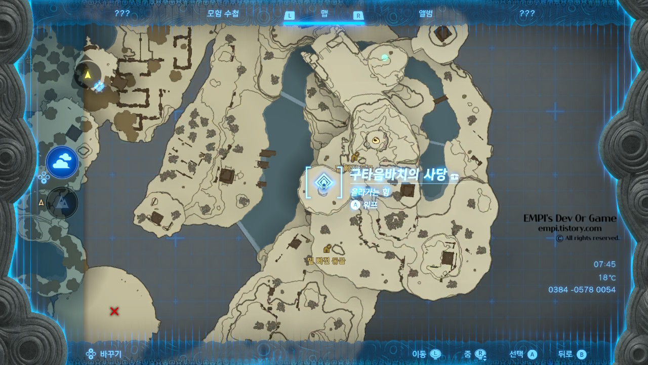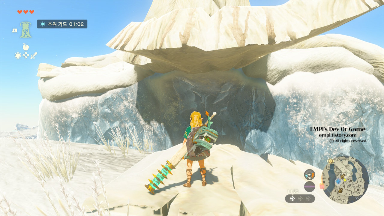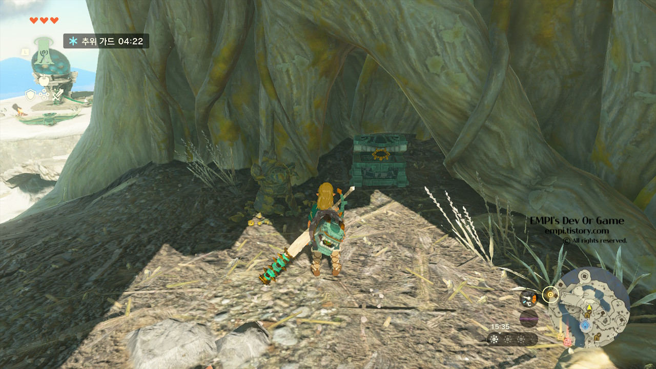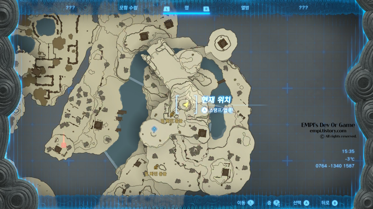 젤다의 전설 왕국의 눈물 티어스 초반 방한복 위치는 구타음바치의 사당에서 오른쪽에 나무기둥을 타고 올라오면 얻을 수 있다. 맵 상의 위치(좌표)는 아래 사진을 참고 하자.