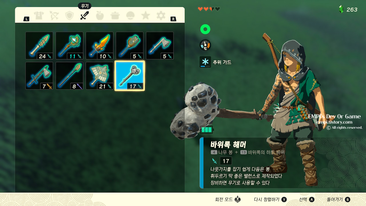 죽고나면 바위록의 하트 바위를 얻을 수 있는데, 스크래 빌드로 무기에 달아 보도록 하자.