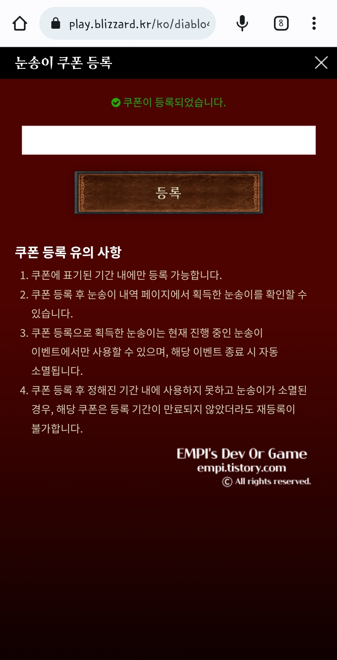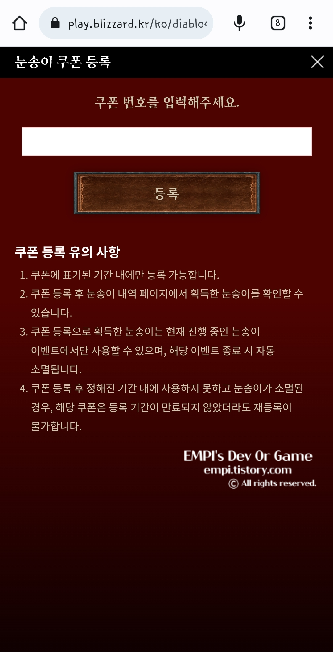 | 디아블로 4 코드 등록 방법 (버거킹 형상 변환 장비 쿠폰 입력 방법 및 게임에서 확인 방법) (0) | 2023.06.08 |