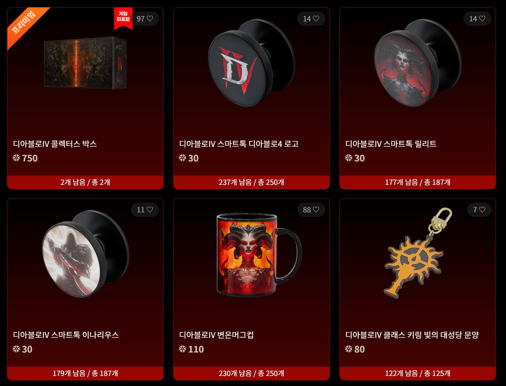 열심히 모은 눈송이 포인트로 디아블로 4 굿즈를 살 수 있습니다. 아래 사진 외에도 꽤 많습니다. 디아블로 매니아라면 하나쯤은 소지해야 될 것 같네요. 벌써 디아블로 4 콜렉터스 박스는 끝났습니다.