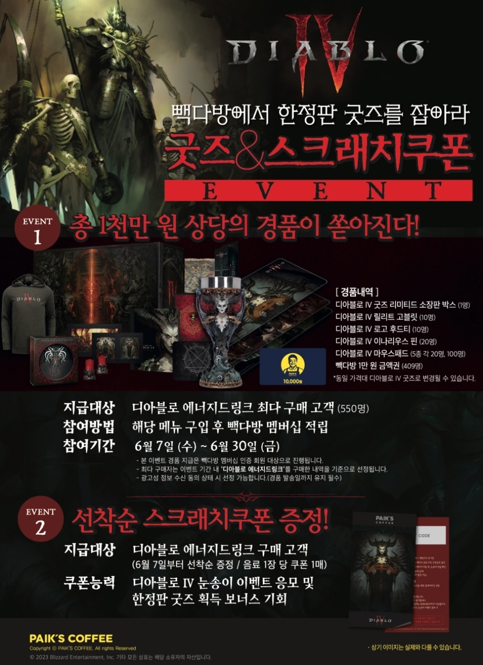 디아블로 IV 출시를 기념하여 진행되는 이벤트 및 PC방에서 받으실 수 있는 혜택에 대해 안내 드립니다.