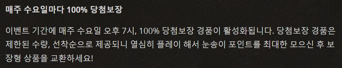 매주 수요일 오후 7시 마다 100% 당첨 보장 경품이 활성화됩니다. 제한된 수량 선착순으로 제공되기 때문에 눈송이 포인트를 최대한 모아서 보장형 상품과 교환 하면 됩니다.