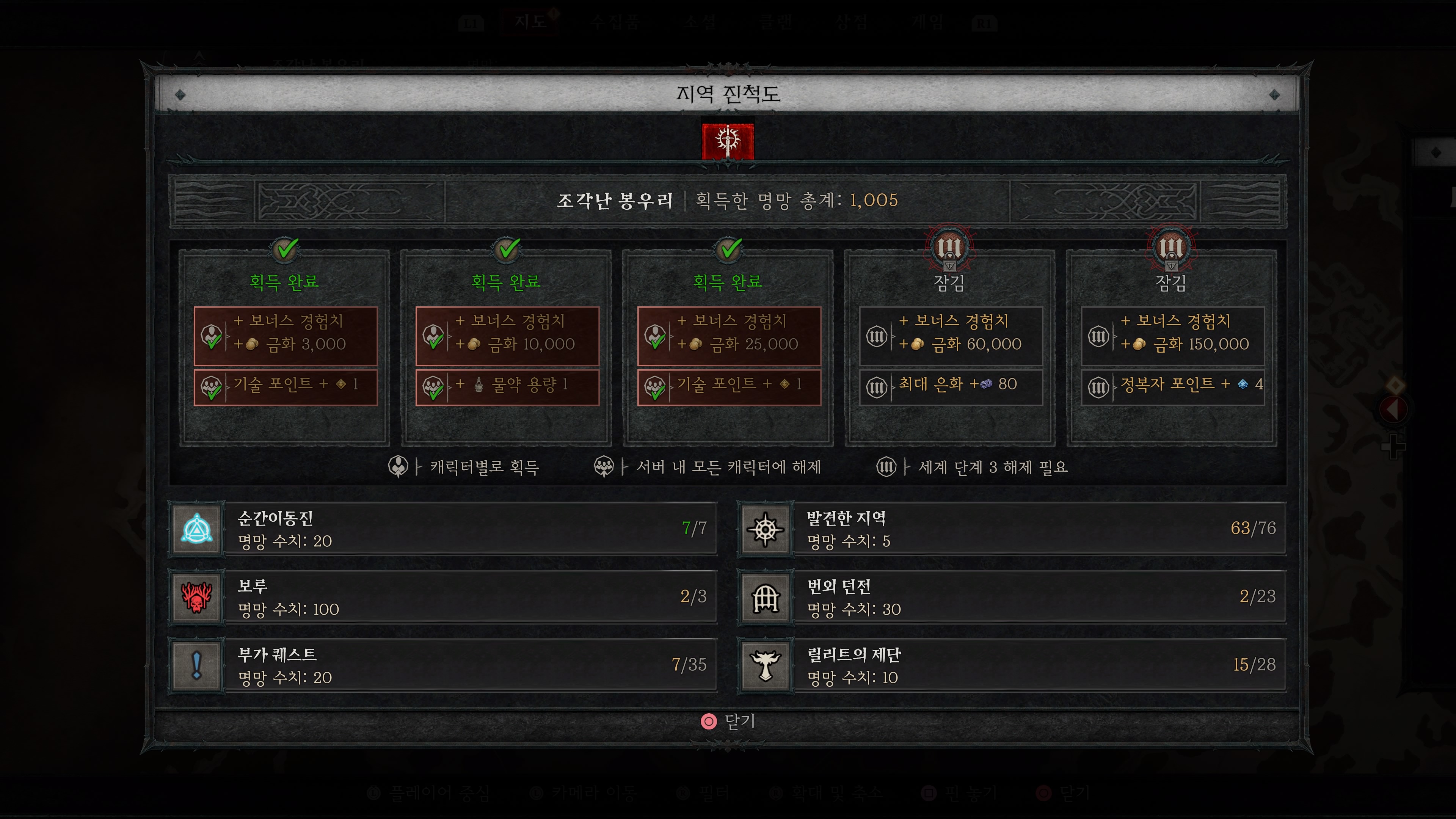 명망작은 순간이동진, 보루, 부가퀘스트(파란색 느낌표), 발견한 지역, 번외 던전, 릴리트의 제단 등을 통해 완료 할 수가 있는데, 얻을 수 있는 건 기술 포인트 1개 업, 물약 용량 1개 업, 기술포인트 1개 업, 최대 은화 증가, 정복자 포인트 4개 업 을 할 수가 있습니다.