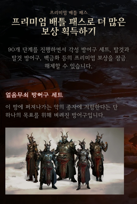 악의 종자 시즌에서 프리미엄 배틀 패스를 하게 되면 얼음무쇠 방어구 세트, 탈것, 탈것 방어구, 백금화를 해제 할 수 있습니다.