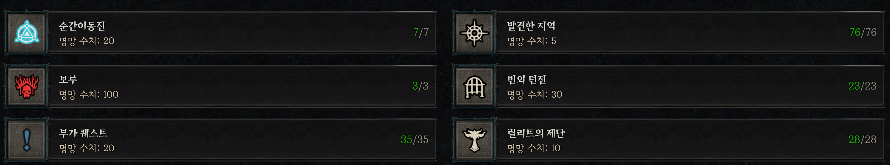 시즌에서는 기존에 완료한 명망작을 가지고 갈 수 있습니다. 가지고 가는 명망작으로는 발견한 지역과 릴리트 재단입니다. 그러므로 시즌이 시작 되기전에 릴리트 재단과 발견한 지역을 완료해야 시즌을 쉽게 시작 할 수 있습니다.