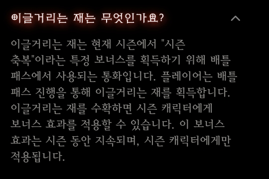 이글거리는 재는 시즌 축복이라는 특정 보너스를 획득하기 위해 배틀 패스에서 사용되는 통화입니다. 배틀 패스 진행을 통해 이글거리는 재를 획득 가능하고, 이걸 이용해 시즌 축복 활성화를 할 수 있습니다. 시즌 축복은 시즌 동안 지속되며 시즌 캐릭터에게만 적용 됩니다.