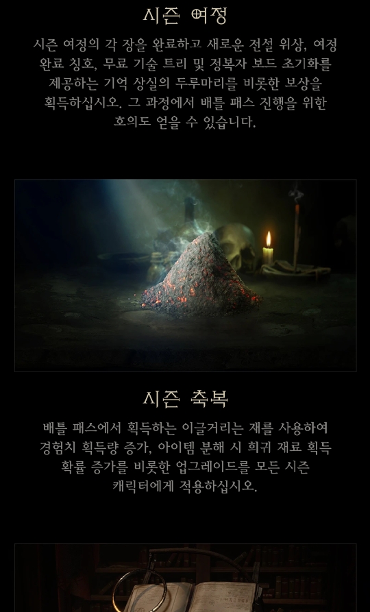 그 밖에 시즌 여정을 통해 새로운 전설 위상, 여정 완료 칭호, 무료 기술 트리 및 정복자 보드 초기화가 가능한 기억 상실의 두루마리를 보상으로 획득 가능합니다. 또한 배틀 패스 진행을 위한 호의도 획득 가능 합니다.