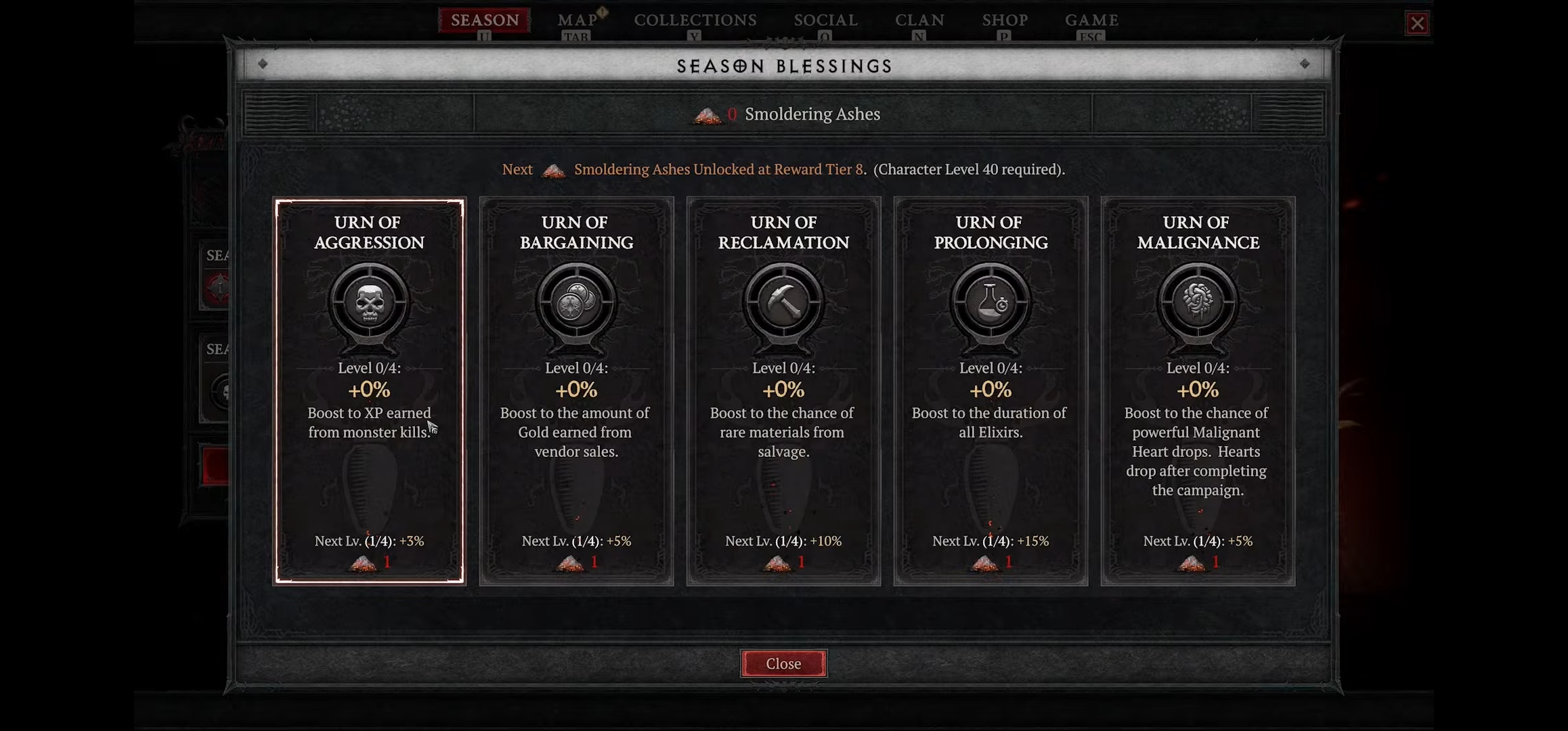 악의 종자 시즌에서 배틀 패스를 통해 이글거리는 재를 획등 가능한데, 이글거리는 재를 통해 경험치 획득량 증가, 희귀 재료 획득 등의 축복을 받을 수 있습니다. 해당 축복은 시즌 캐릭터에만 적용 됩니다.