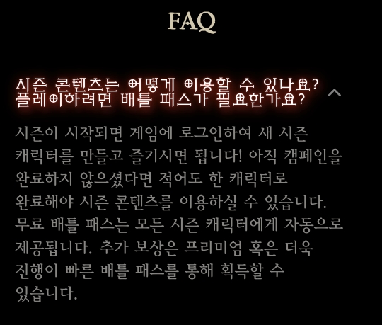 시즌이 시작되면 새 시즌 캐릭터를 만들고 플레이하면 됩니다. 단, 메인 캠페인을 적어도 하나의 캐릭터로 완료해야 됩니다. 무료 배틀 패스가 있으며 사용 가능 합니다.