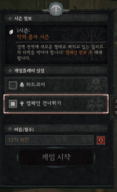 기존에 디아블로 4 캠페인을 완료하지 않았으면 캠페인 건너뛰기 버튼이 보이지 않습니다.