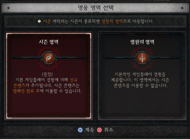 영웅 영역 선택에서 시즌 영역을 선택하면 캐릭터가 시즌 캐릭터로 생성이 됩니다.