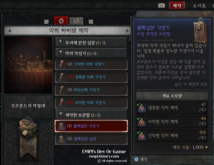 그래서 방법을 찾던 중, 코르몬드의 작업대에서 불확실한 각성기를 제작하여 진노한 악의 각성기를 얻을 수 있었습니다.