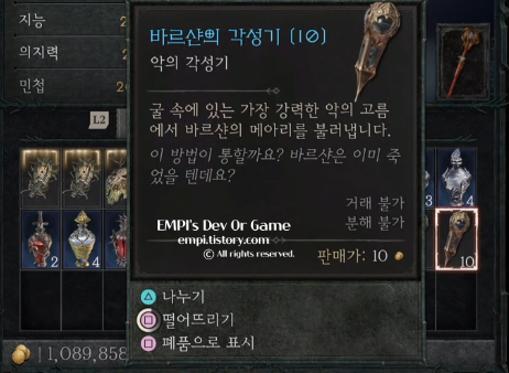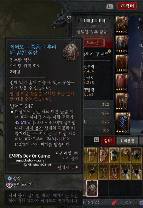 죄어오는 죽음의 우리에 갇힌 심장(진노한 심장)을 얻게 되었습니다. 바르샨의 심장보다 능력치가 살짝 높게 나오네요. 고행가서 고통받는 바르샨의 각성기를 이용하여 바르샨의 심장을 얻어 봐야 겠습니다.