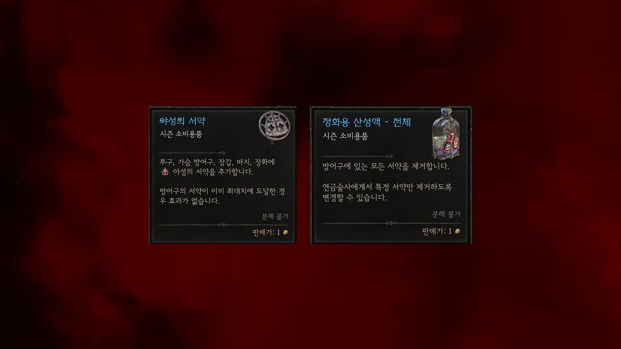 방어구에 서약을 추가하거나 삭제도 가능합니다. 추가는 독립형 서약을 이용해서 가능하고, 정화용 산성액을 이용해서 여러개의 서약을 제거 할 수도 있습니다.