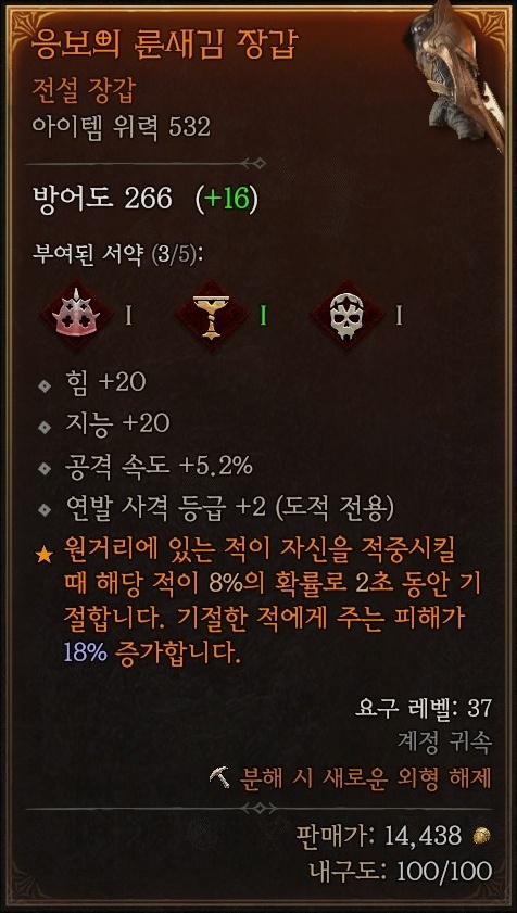뾰족한 쐐기 (야성의 서약 1개, 신성의 서약 1개): 가시가 10%의 확률로 적에게 300% 증가한 피해를 주고 8% 확률로 오한을 부여합니다.