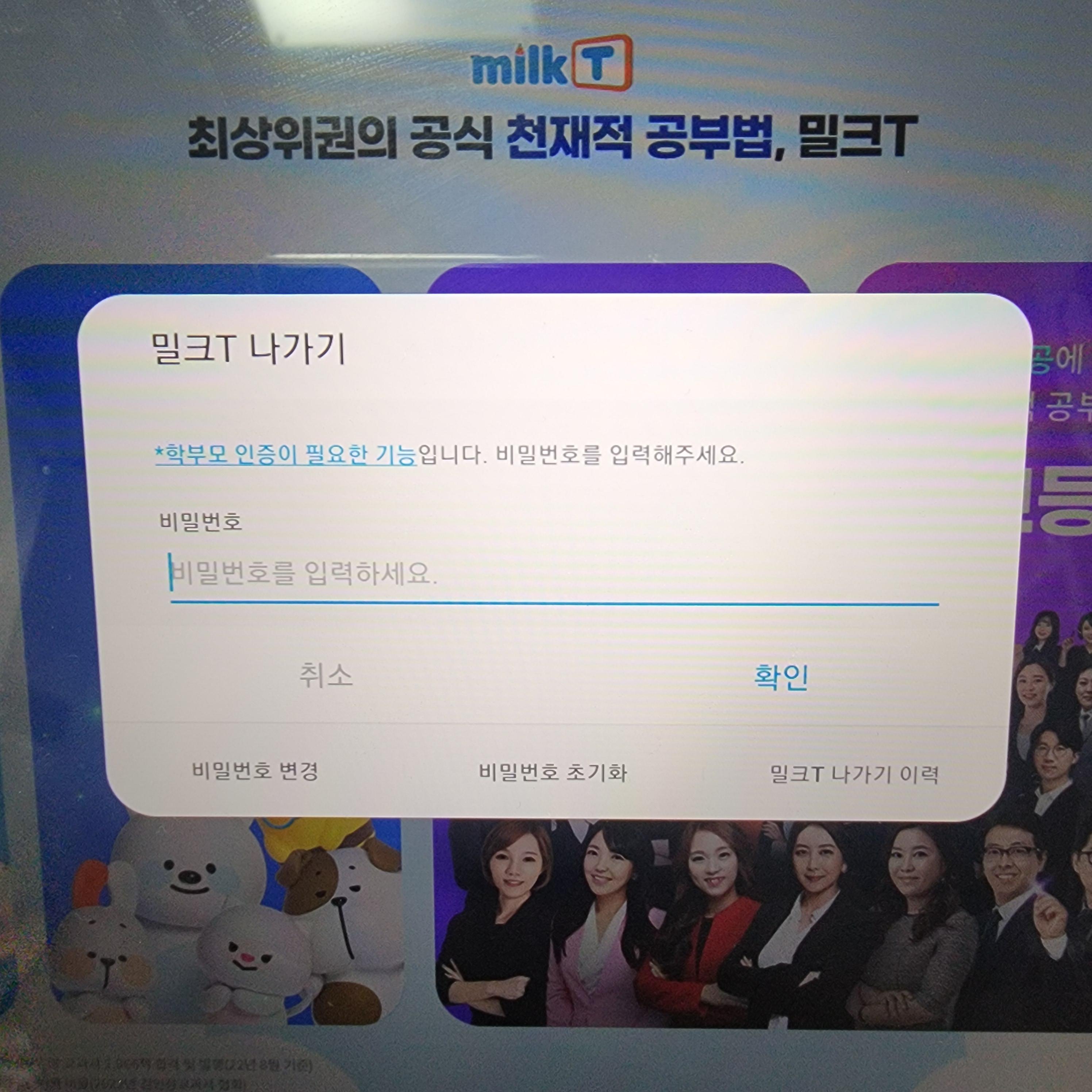 비밀번호 785612를 입력 합니다. 비밀번호를 바꾸지 않았으면 앞에 비밀번호로 밀크T 나가기가 됩니다. 만약에 비밀번호가 다르다면 고개센터에 문의해 보셔야 합니다.