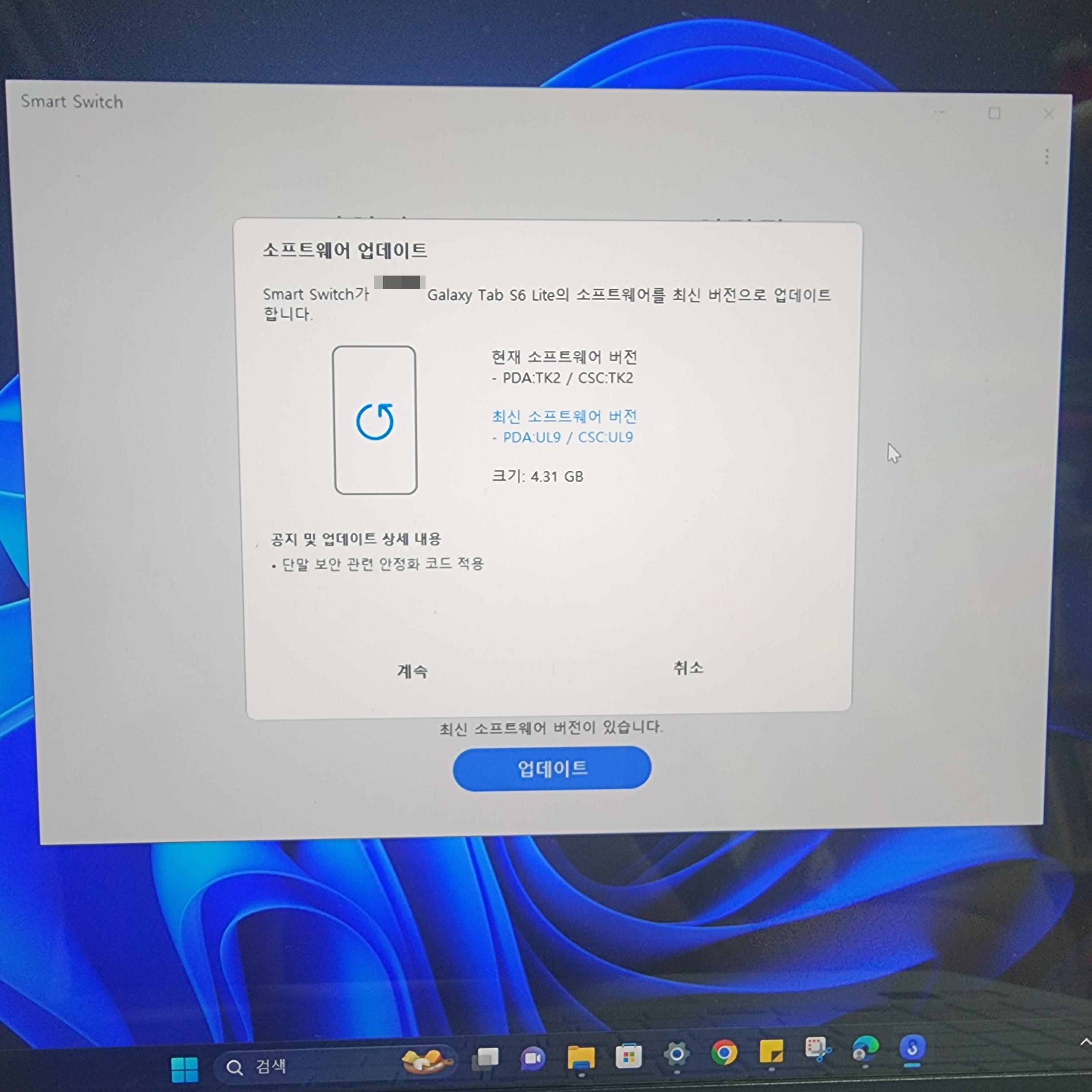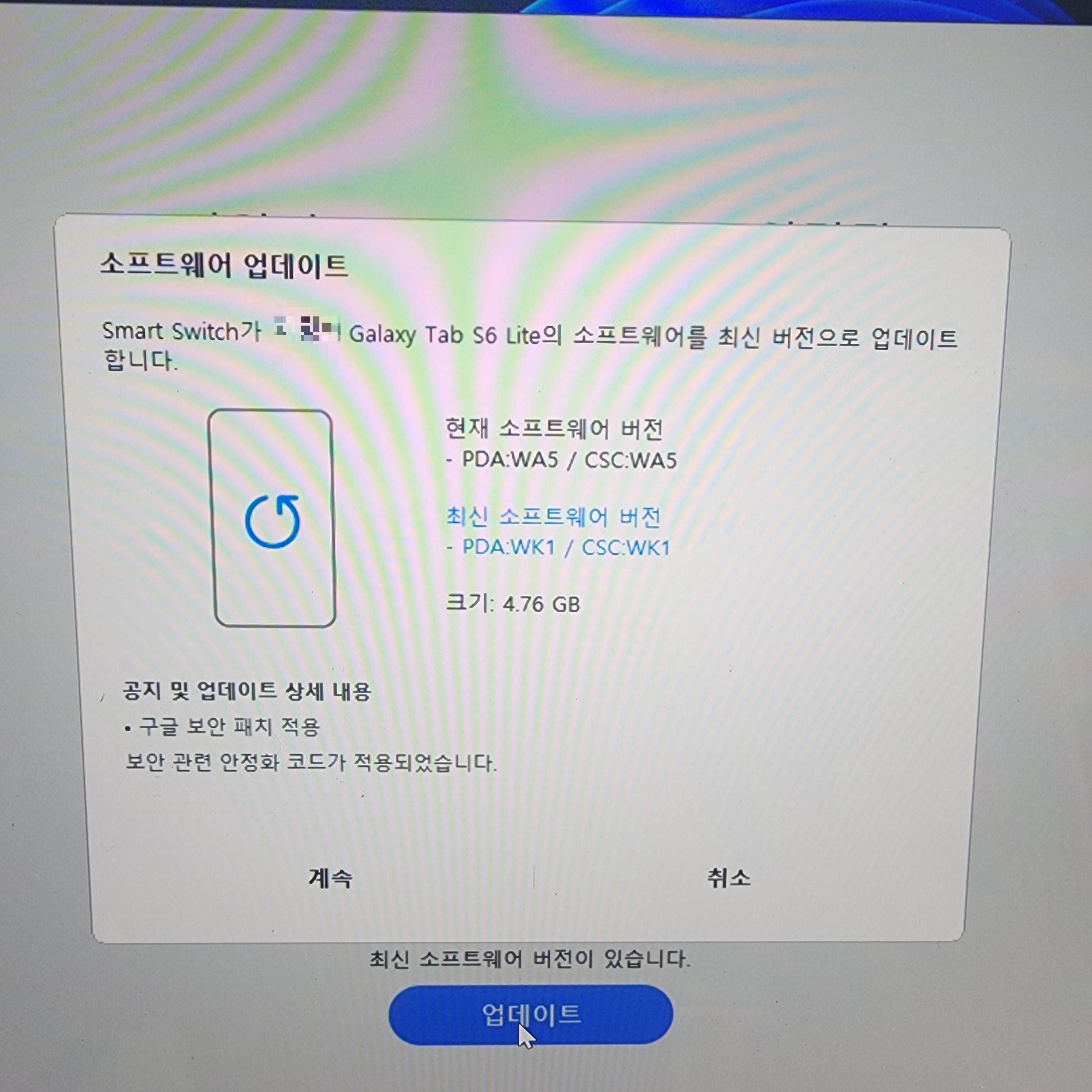 스마트 스위치 프로그램을 실행하고 USB를 PC에 연결한 다음 갤럭시탭 s6 Lite를 연결합니다. 그러면 소프트웨어 업데이트가 나타나고 업데이트를 진행하면 됩니다.