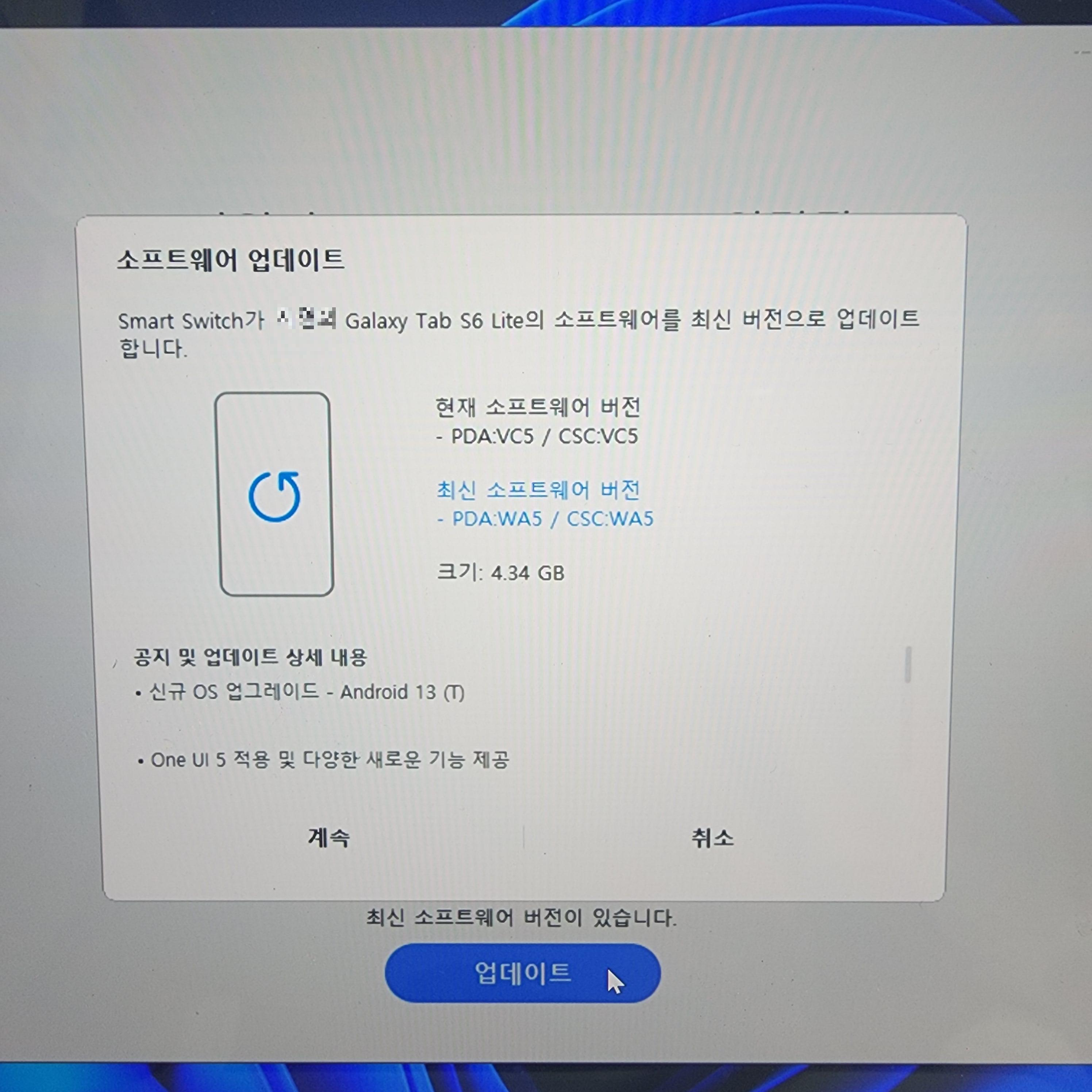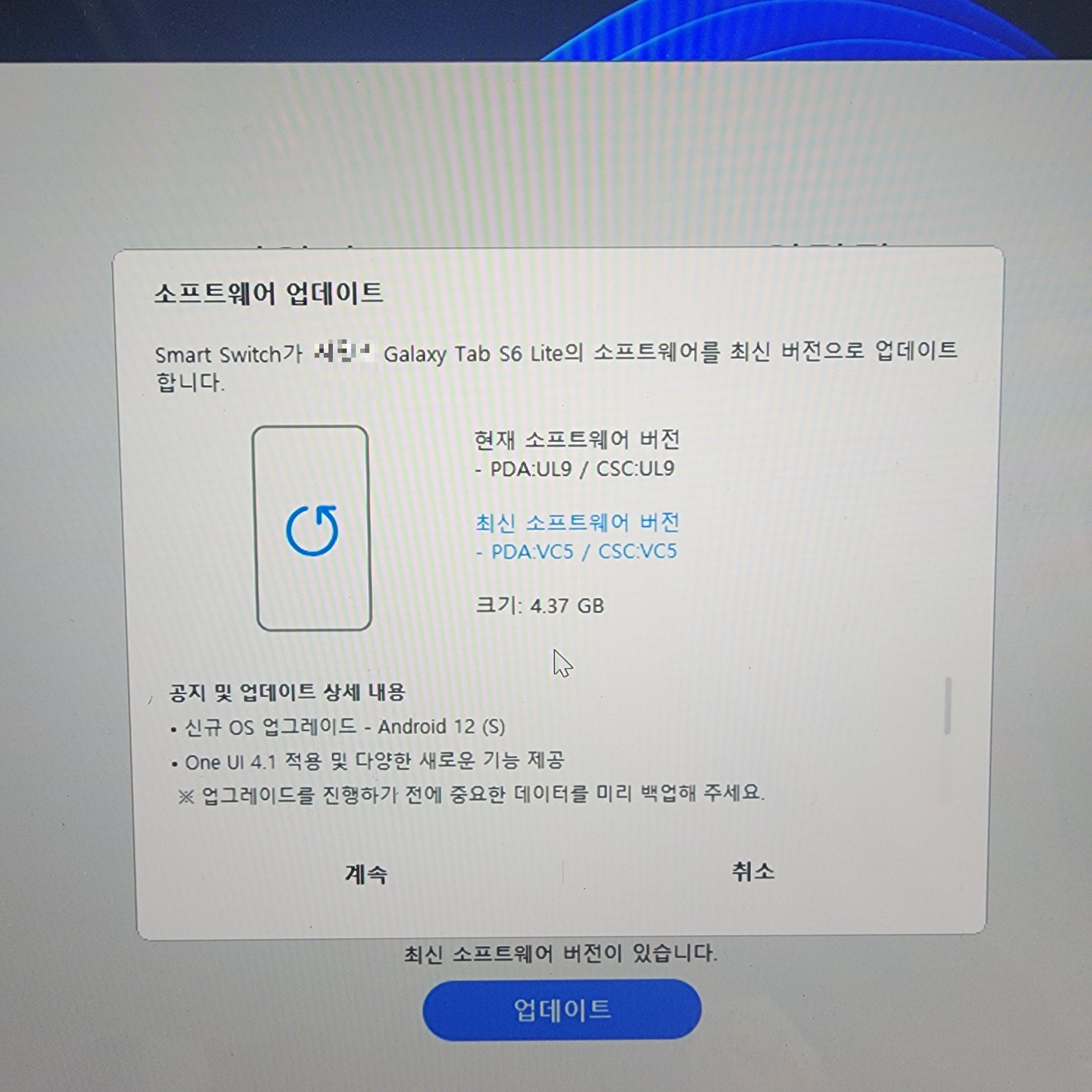 그럼 다시 스마트 스위치를 실행하고 갤럭시탭 s6 Lite를 연결합니다. 다시 또 업데이트를 진행합니다. 업데이트 버튼이 나타나지 않을 때 까지 반복합니다. 이번 업데이트는 안드로이드 12로 업그레이드 해줍니다.