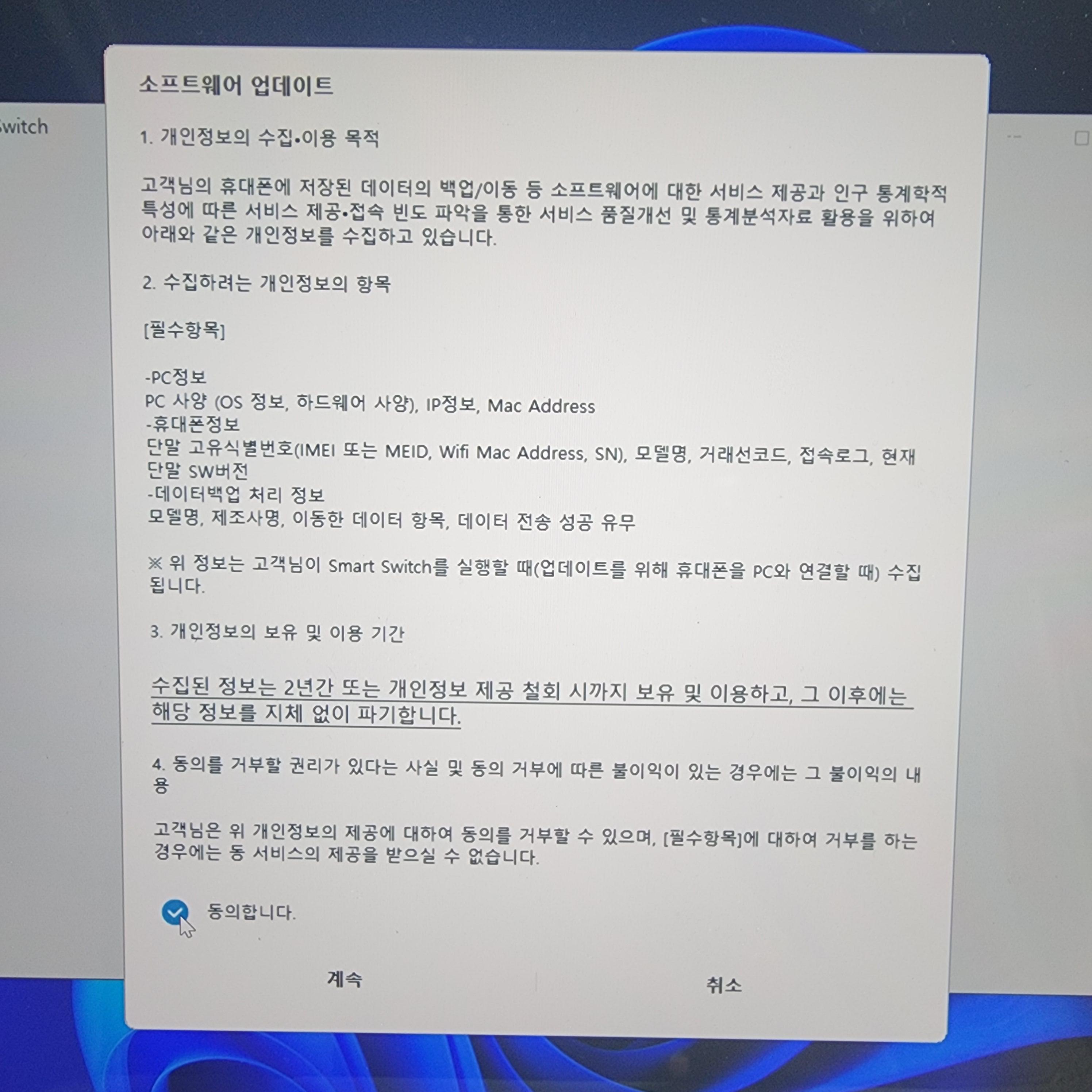 동의 버튼을 클릭 후 계속 버튼을 누릅니다.