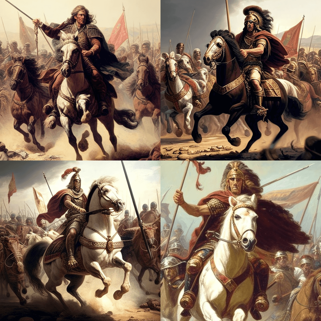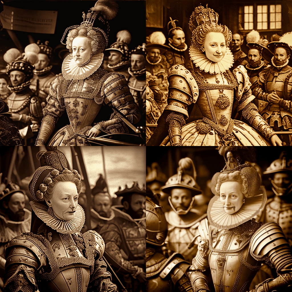 기원전 330년에 알렉산더 대왕이 페르시아 제국을 정복하고 말을 탄 강력한 통치자와 그의 군대가 깃발과 무기를 들고 전진하는 모습을 그린 그림입니다. - A photo of Queen Elizabeth I giving a speech to her troops before the Spanish Armada in 1588, with a stern and confident expression and her red hair blowing in the wind.