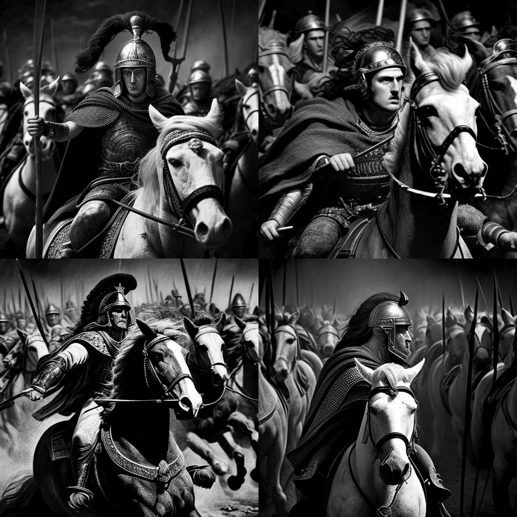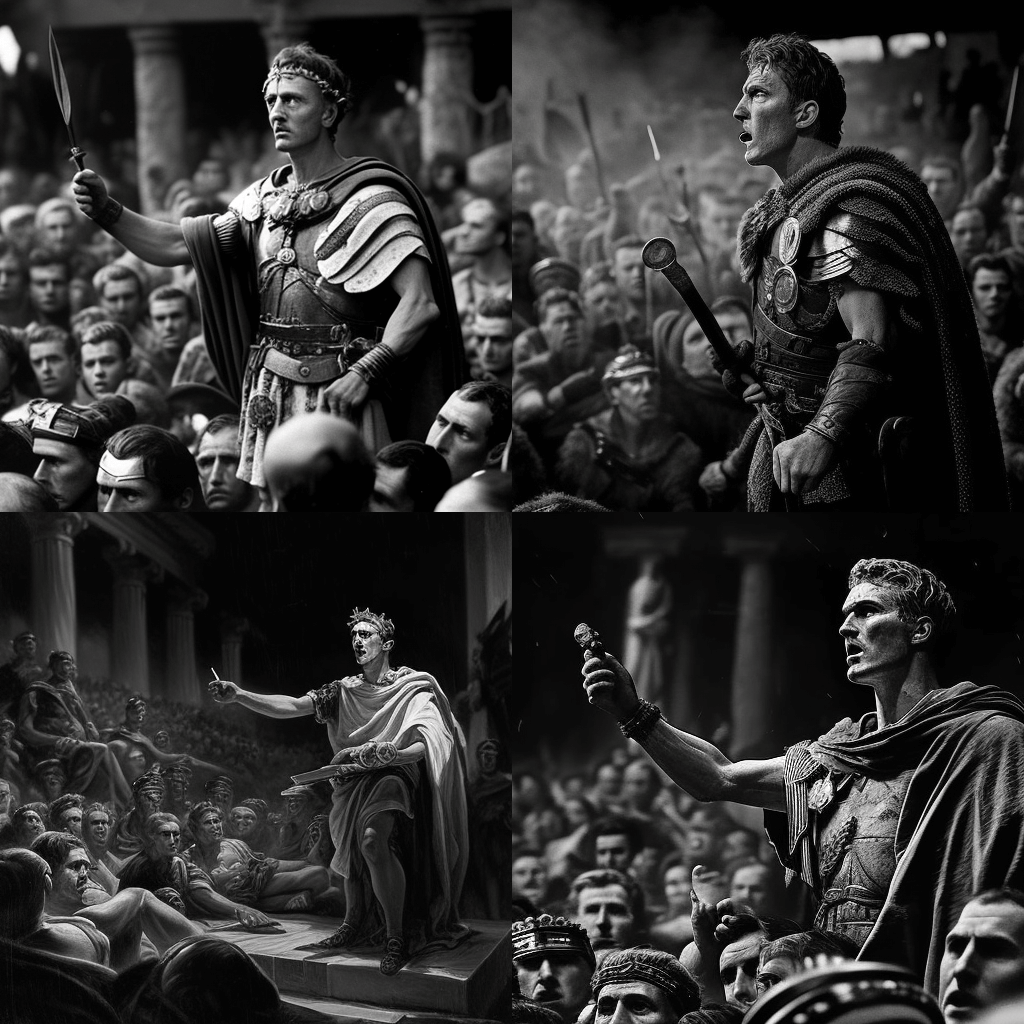 기원전 49년, 로마 군인들에 둘러싸여 루비콘 강을 건너는 율리우스 카이사르와 함께한 시간 여행자의 셀카를 오래된 유화 스타일로 표현했습니다. - A black-and-white photograph of a young Winston Churchill giving a rousing speech in the House of Commons in London, England, in 1940, in the style of a historical documentary.