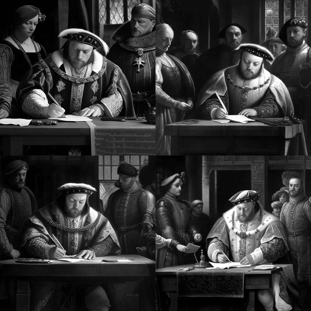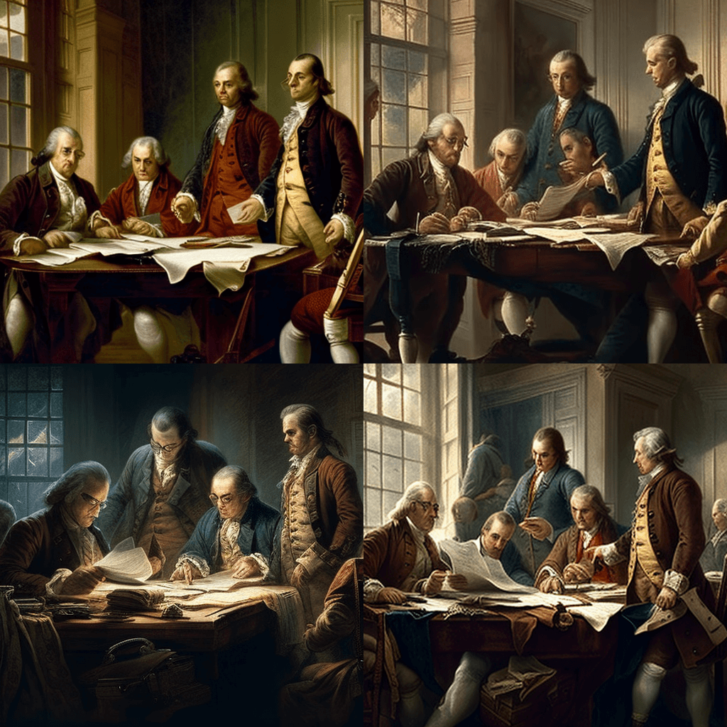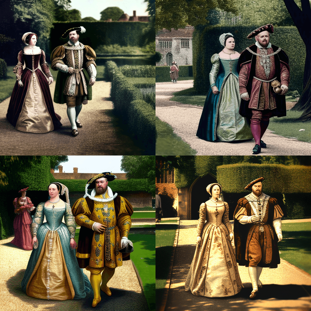 1776년 독립선언서에 서명한 건국의 아버지들의 단체 사진. 중앙에 존 핸콕의 굵은 서명이 있고 배경에는 웃고 있는 벤자민 프랭클린이 있습니다. - A time-traveler’s photo of King Henry VIII and Anne Boleyn walking in the gardens of Greenwich Palace in 1536, with the king looking handsome and the queen wearing a stunning dress.