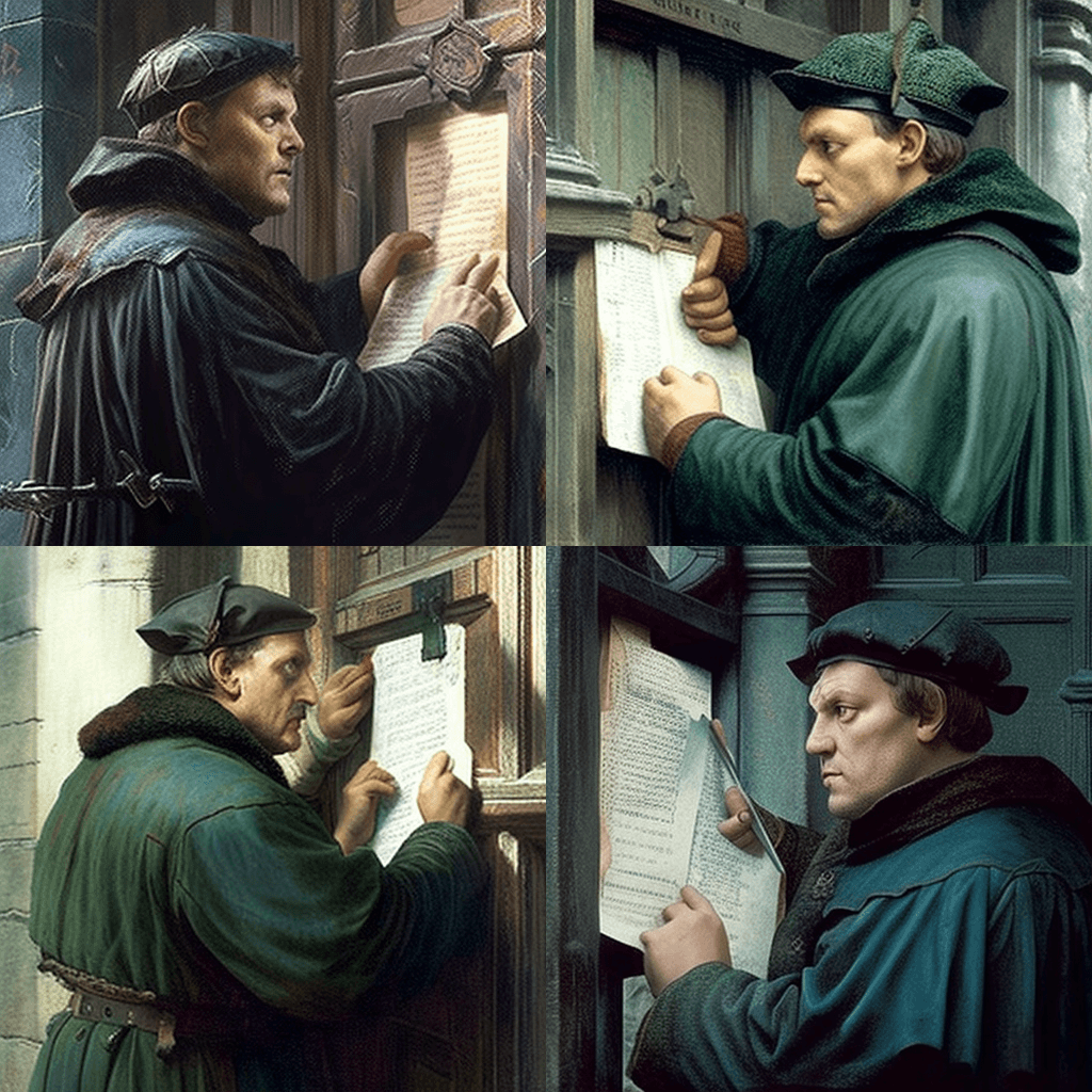 1517년 독일 비텐베르크 성 교회 문에 95개조 논제를 못 박는 마틴 루터의 모습을 역사 다큐멘터리 스타일로 찍은 흑백 사진. - A snapshot of Mozart composing his latest symphony in Vienna, Austria, in the year 1791, surrounded by instruments and sheet music.