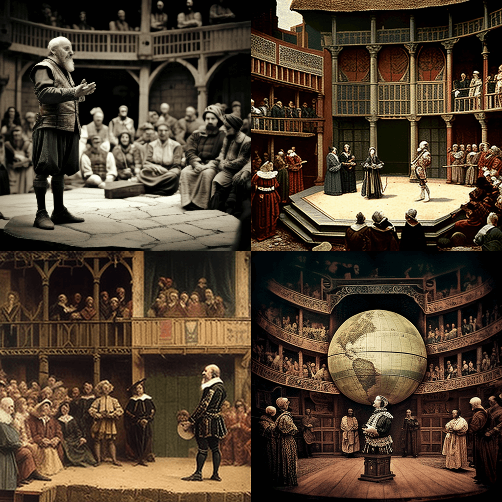1922년 이집트 왕들의 계곡에 있는 투탕카멘 왕의 묘실을 찍은 폴라로이드 사진. 상징적인 황금 마스크가 전시되어 있습니다. - A snapshot of William Shakespeare on the stage at the Globe Theater in London, England, in the year 1600, with actors rehearsing a scene from “Hamlet”.
