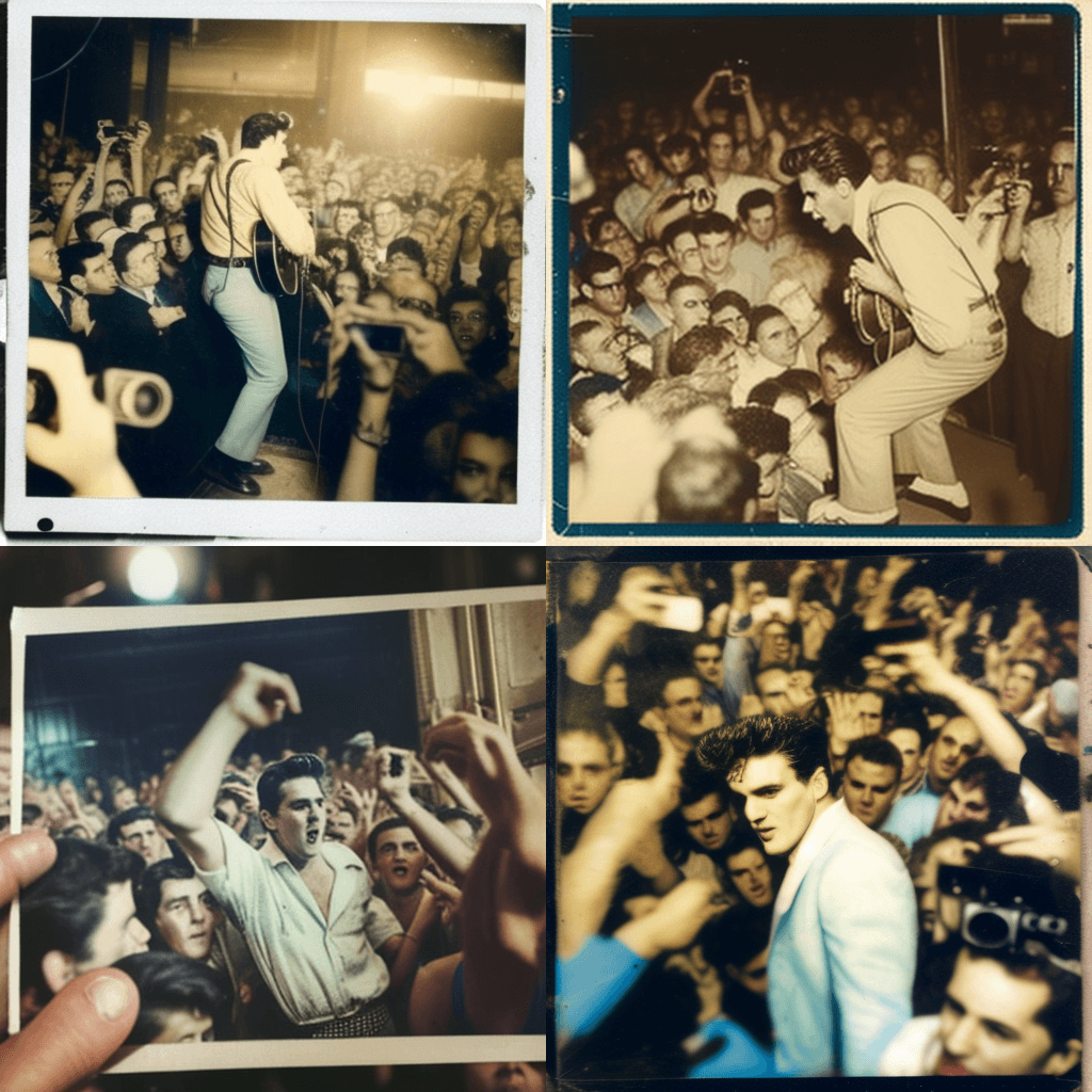 1955년 테네시 주 멤피스에서 공연하는 젊은 엘비스 프레슬리의 폴라로이드 사진. 군중은 열광하고 상징적인 파란색 스웨이드 신발이 전시되어 있습니다. - A time-traveler’s selfie with Julius Caesar crossing the Rubicon in 49 BC, surrounded by Roman soldiers, in the style of an old oil painting.
