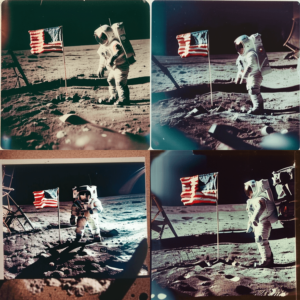 미국 혁명 당시 델라웨어 강을 건너는 조지 워싱턴의 컬러 사진, 1776년 - A polaroid photo of the first man on the moon, Neil Armstrong, planting the American flag, 1969