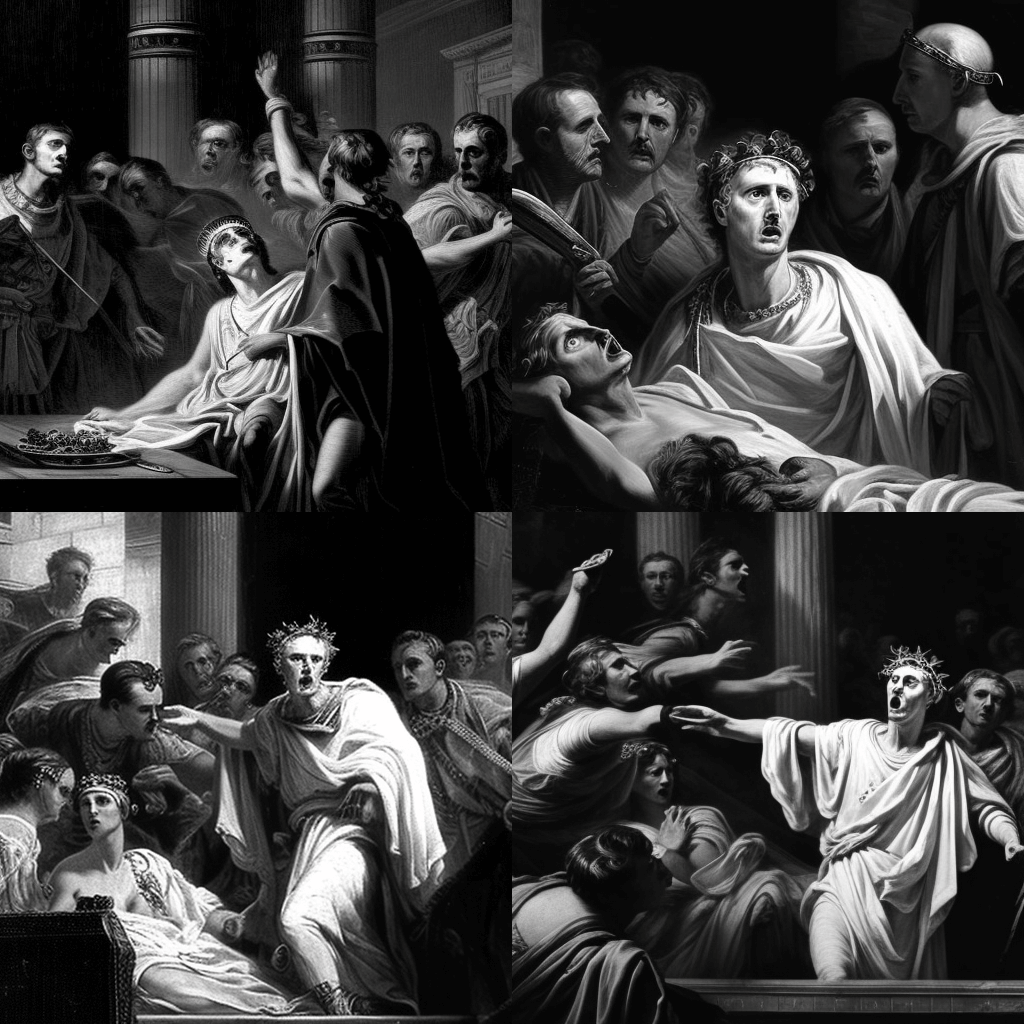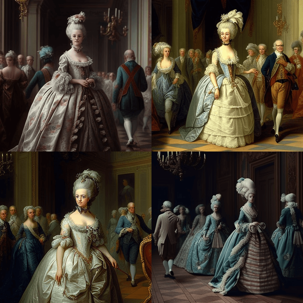 1774년 베르사유 궁전을 걷고 있는 마리 앙투아네트의 사진. 프랑스 여왕은 신하들에게 둘러싸여 아름다운 드레스와 가루 가발을 착용하고 있습니다. - A photograph of Julius Caesar giving a triumphant speech to a cheering crowd of Roman citizens in 44 BC, in the style of an old oil painting.