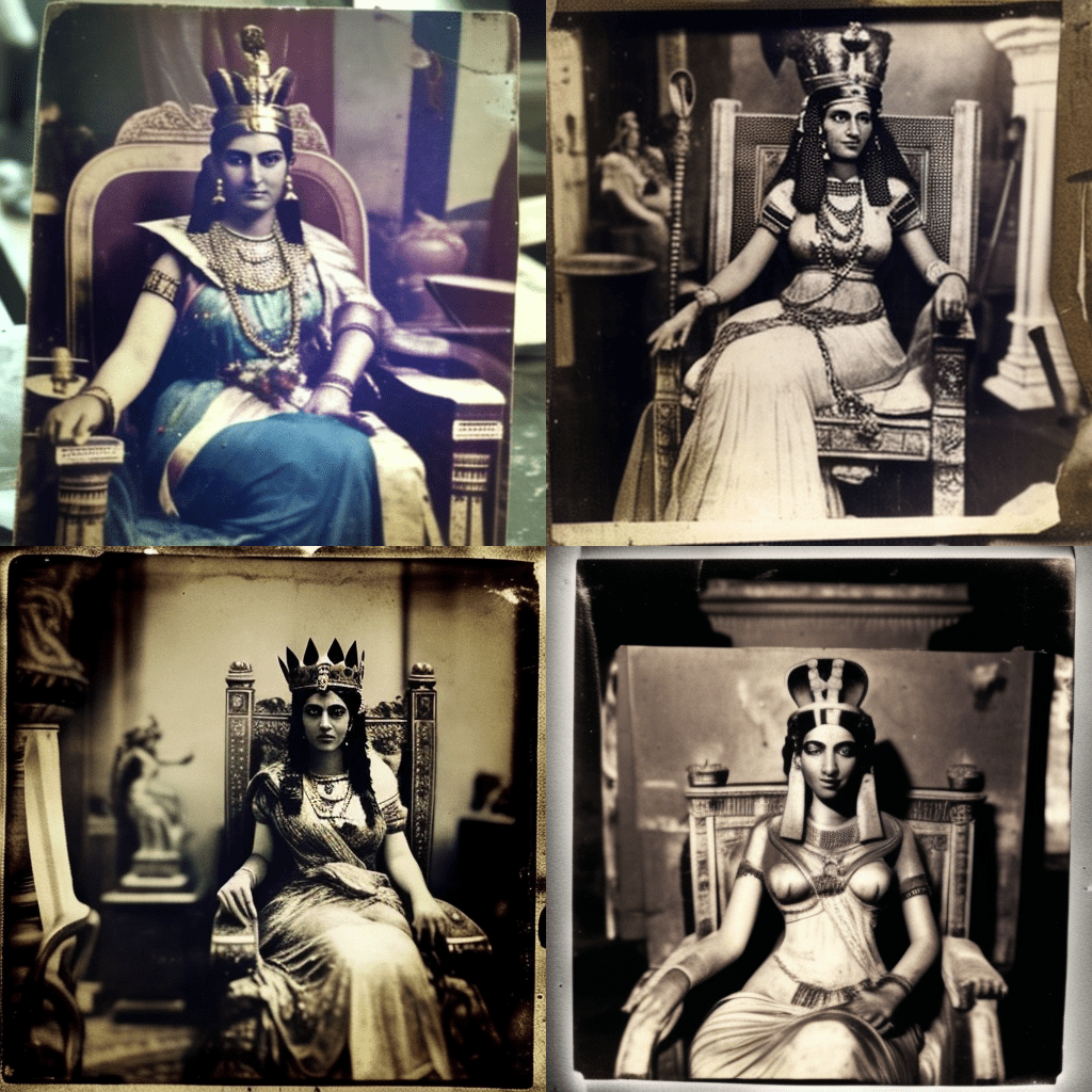 - A polaroid photo of Cleopatra VII, the last Pharaoh of Ancient Egypt, sitting on her throne in Alexandria, 51 BC