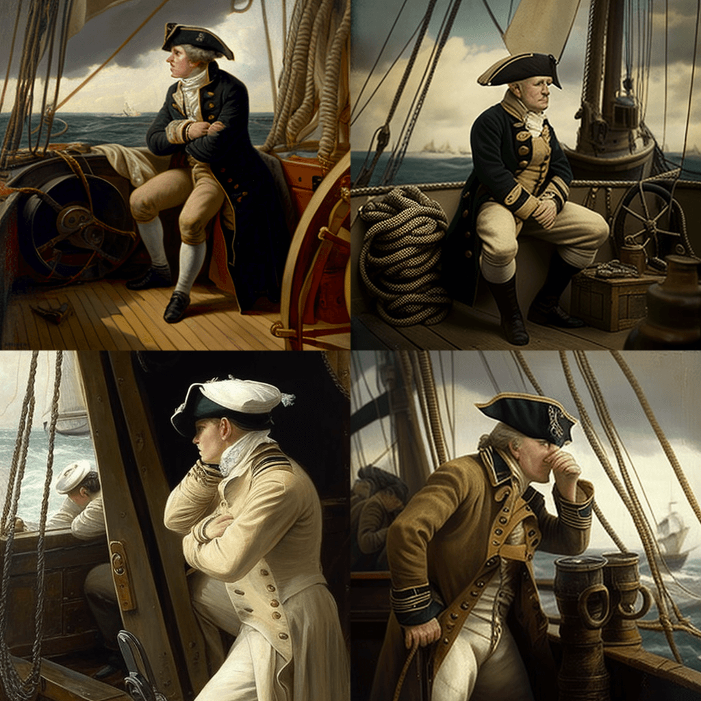 1824년 오스트리아 비엔나에서 베토벤이 교향곡 9번을 지휘하는 모습을 찍은 스냅샷. 음악가들과 청중들에 둘러싸여 있습니다. - An anonymous sailor on the deck of the HMS Victory at the Battle of Trafalgar in 1805, in the style of an oil painting from the era.