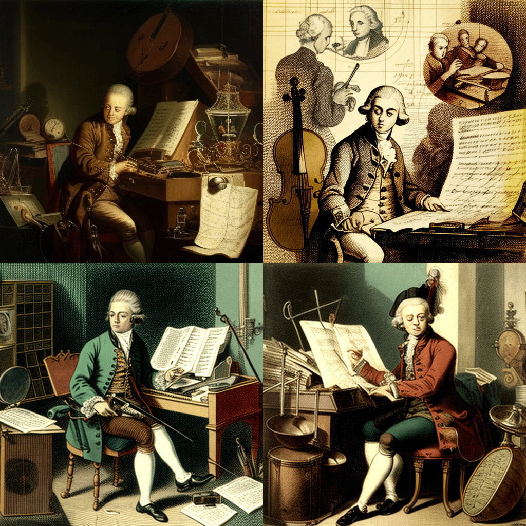 1791년 오스트리아 비엔나에서 악기와 악보에 둘러싸여 최신 교향곡을 작곡하는 모차르트의 스냅샷입니다. - An anonymous knight in shining armor, riding his horse into battle at the Battle of Crecy in France in 1356, in the style of a medieval illuminated manuscript.