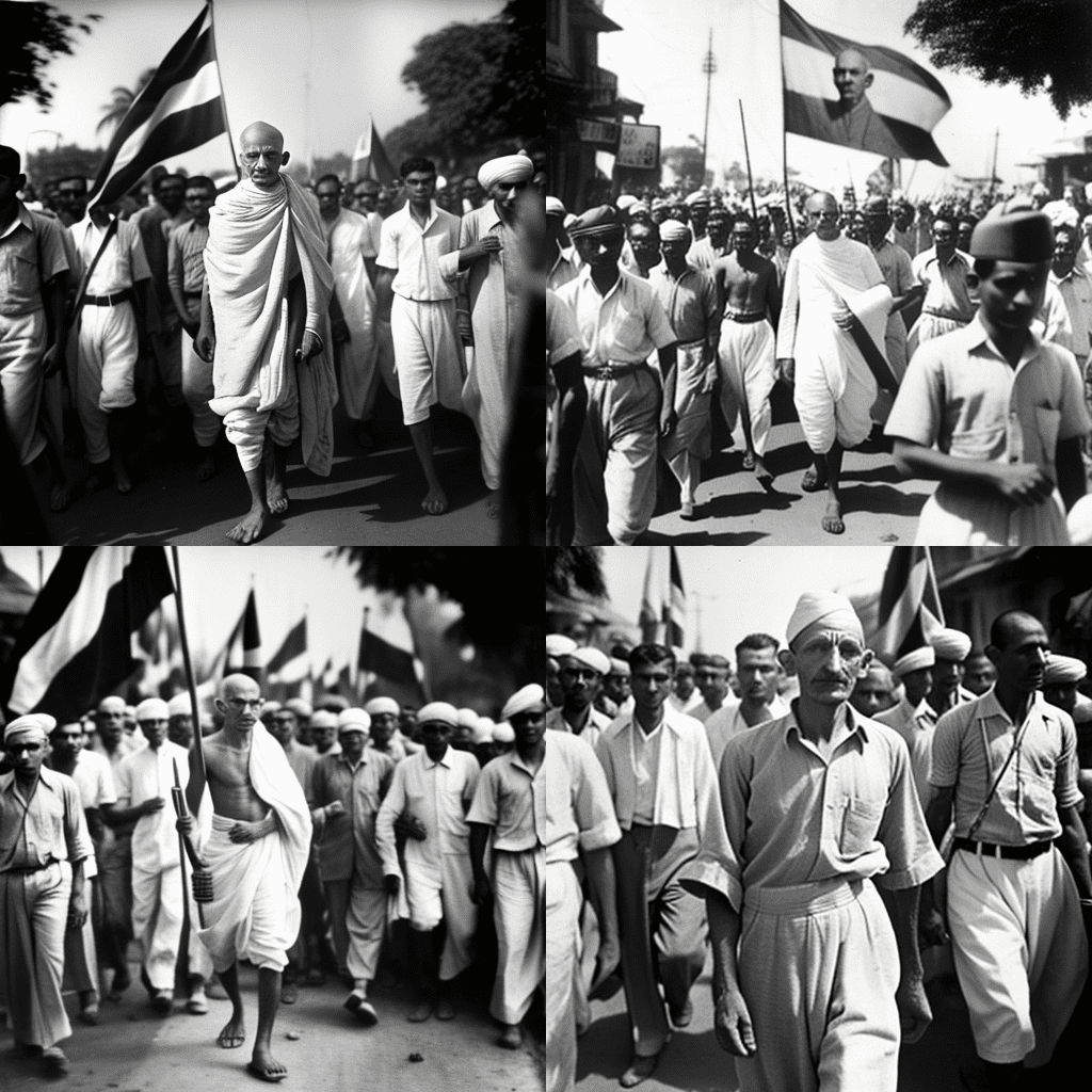 - A black and white photo of Mahatma Gandhi leading a peaceful protest march in India, 1948