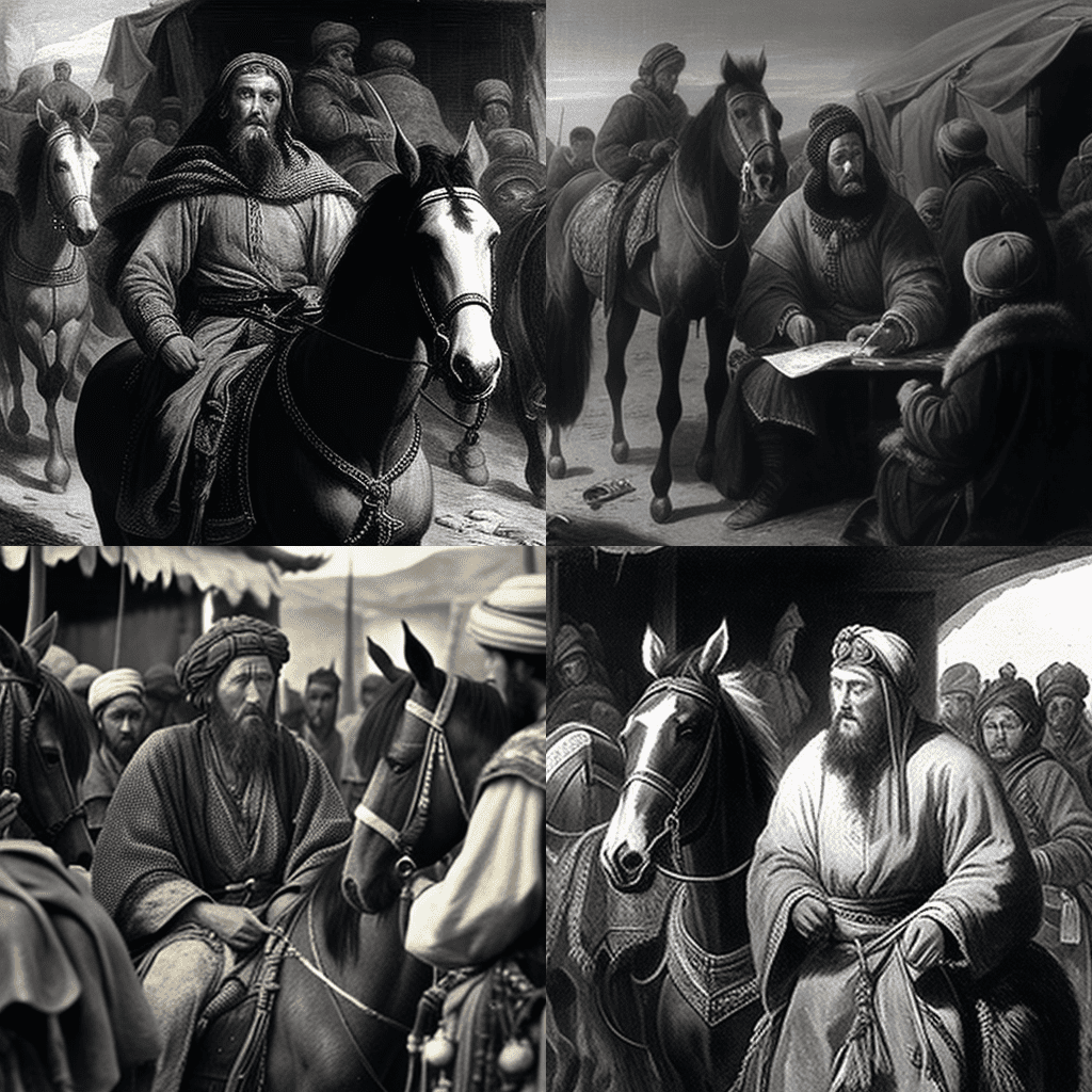 마르코 폴로가 1295년 동방 여행을 마치고 베네치아로 돌아오는 장면. 그의 얼굴에는 흥분과 놀라움의 미소가 떠돌고, 보물을 낙타에 싣고 있었습니다. - A time-traveler’s selfie with William the Conqueror at the Battle of Hastings in 1066, with the Norman king wearing his crown and holding his sword, ready to claim the English throne.