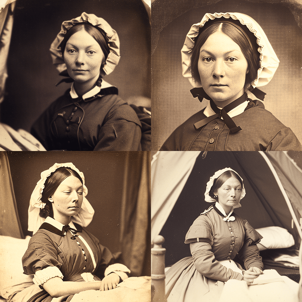 1297년 스털링 다리 전투에서 스코틀랜드군을 이끌고 영국군에 맞서는 윌리엄 월리스의 사진. 용감한 표정과 검을 높이 들고 있는 모습. - A time-traveler’s selfie with Florence Nightingale at the Scutari Hospital in 1854, with the nurse holding a lamp and looking compassionate as she cares for the wounded soldiers.