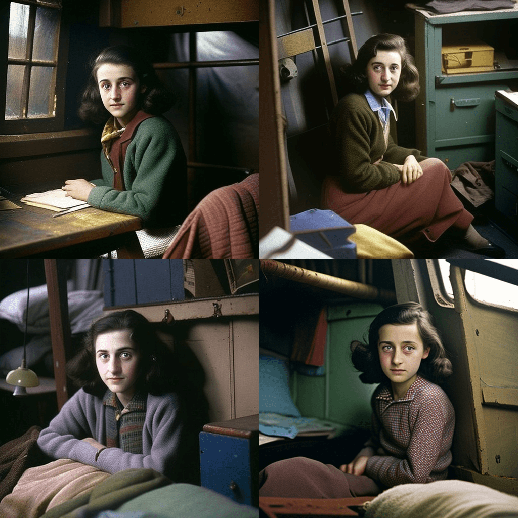 모나리자를 그리는 레오나르도 다빈치의 세피아 톤 사진, 1519년 - A color photo of Anne Frank, sitting in her attic hideaway in Amsterdam, 1942