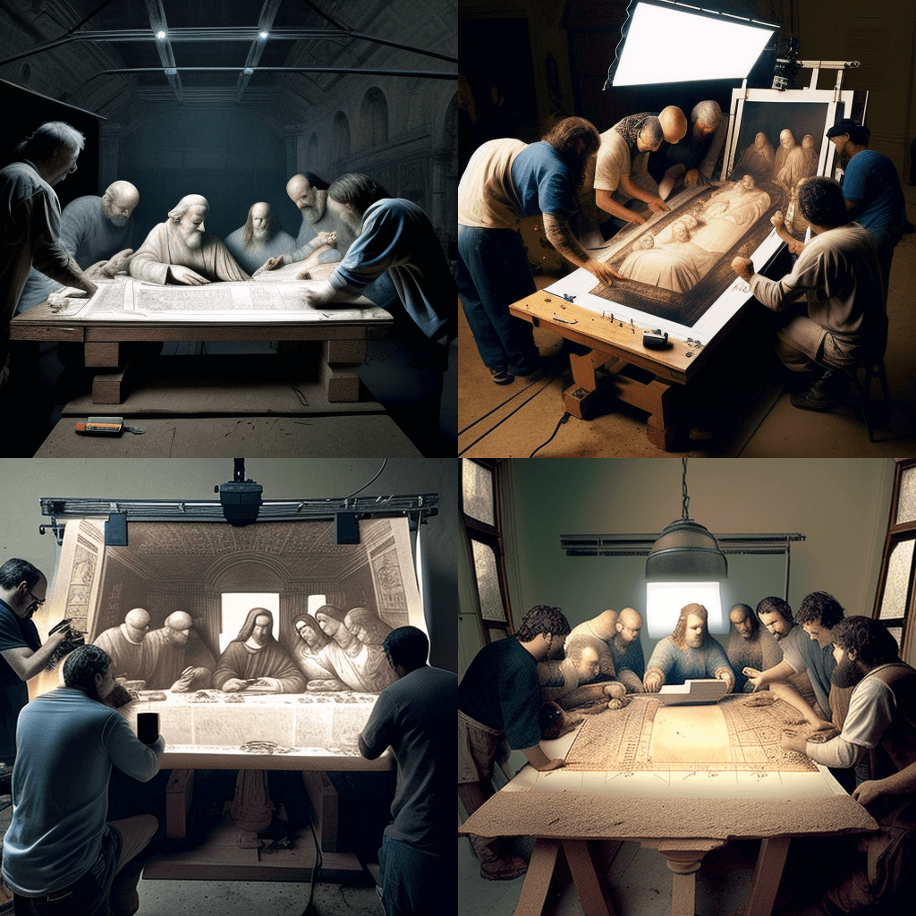 1498년 최후의 만찬을 그린 레오나르도 다빈치의 스냅샷. 탁자 주위에 사도들이 모여 있고 대가가 걸작에 마지막 손질을 하고 있는 모습입니다. - A group photo of the founding fathers signing the Declaration of Independence in 1776, with John Hancock’s bold signature in the center and Benjamin Franklin smiling in the background.