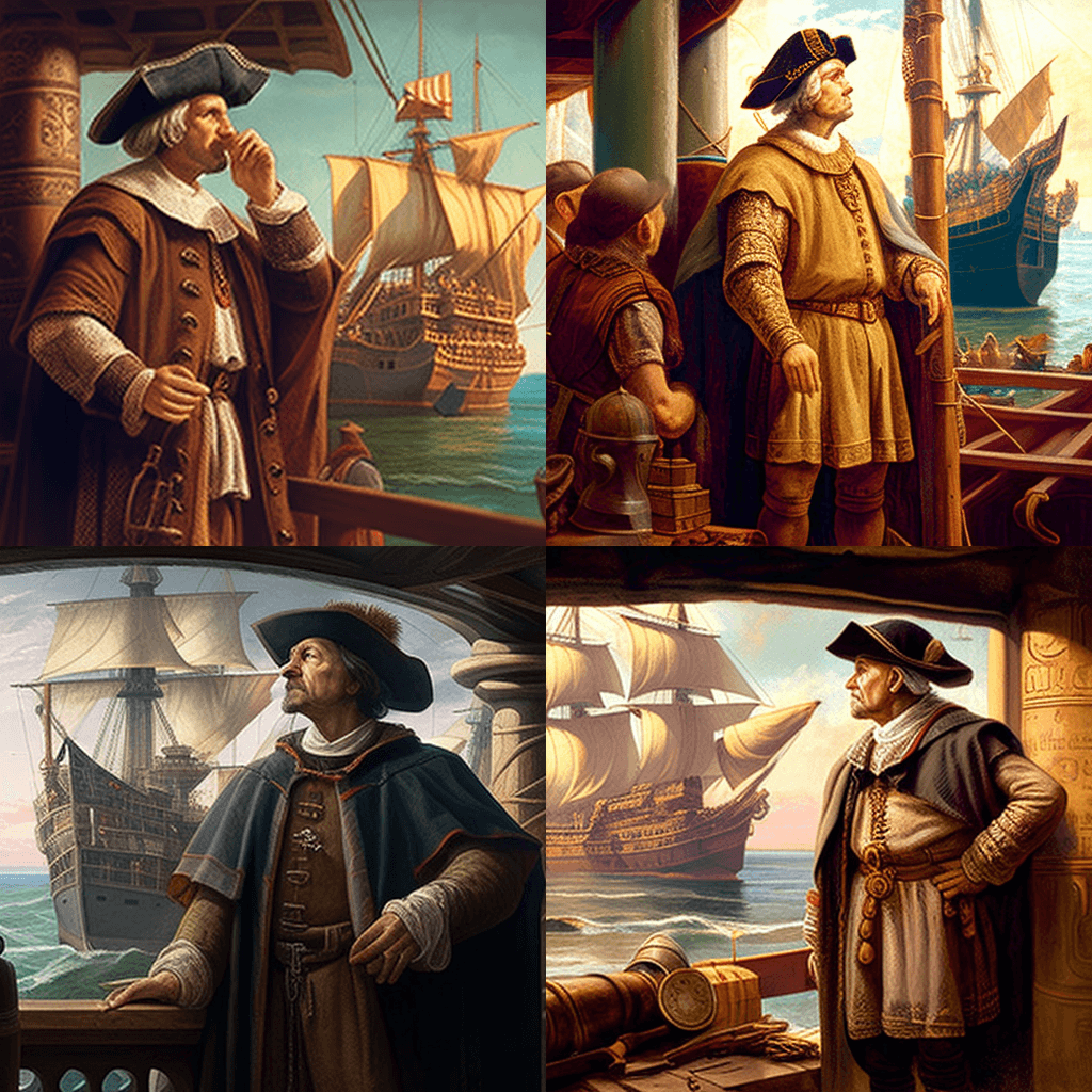 1066년 헤이스팅스 전투에서 정복자 윌리엄과 함께 찍은 시간 여행자의 셀카. 노르만 왕은 왕관을 쓰고 칼을 들고 영국 왕좌를 차지할 준비를 하고 있습니다. - A snapshot of Christopher Columbus discovering America in 1492, with the explorer standing on the deck of his ship and gazing at the new world in wonder and awe.