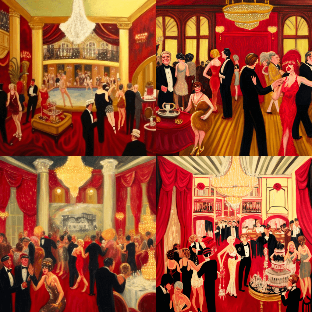 “Gatsby’s Great Gatsby Party” – A 1920s style oil painting shows the interior of Gatsby’s mansion, filled with people dressed in flapper attire, drinking and dancing. Gatsby is in the center of the room, with a glass of champagne in hand, surrounded by guests and his love, Daisy Buchanan. The room is decorated with lush red velvet curtains and sparkling chandeliers. (From F. Scott Fitzgerald’s “The Great Gatsby”) “개츠비의 위대한 개츠비 파티(Gatsby's Great Gatsby Party)” – 1920년대 스타일의 유화는 플래퍼 복장을 입고 술을 마시고 춤을 추는 사람들로 가득 찬 개츠비의 저택 내부를 보여줍니다. 개츠비는 방 중앙에 샴페인 잔을 들고 손님과 그의 연인 데이지 뷰캐넌으로 둘러싸여 있습니다. 객실은 무성한 빨간 벨벳 커튼과 반짝이는 샹들리에로 장식되어 있습니다. (F. 스콧 피츠제럴드의 “위대한 개츠비” 중에서)