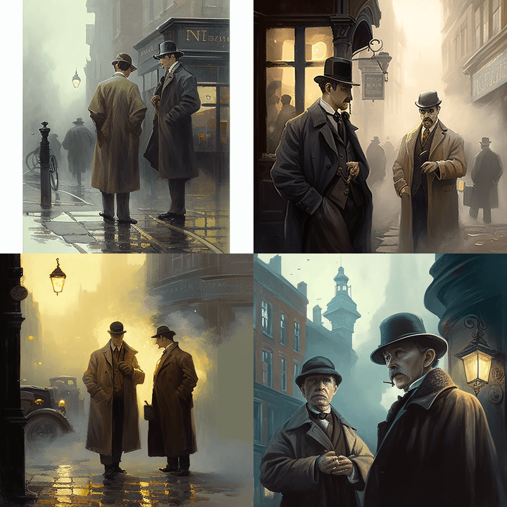 “The Adventures of Sherlock Holmes” by Arthur Conan Doyle – An Edwardian-era illustration of Sherlock Holmes and Dr. Watson in the midst of an investigation, surrounded by the foggy streets of Victorian London. 아서 코난 도일(Arthur Conan Doyle)의 “셜록 홈즈의 모험(The Adventures of Sherlock Holmes)” – 빅토리아 시대 런던의 안개가 자욱한 거리에 둘러싸여 조사를 진행 중인 셜록 홈즈와 왓슨 박사의 에드워드 시대 삽화입니다.