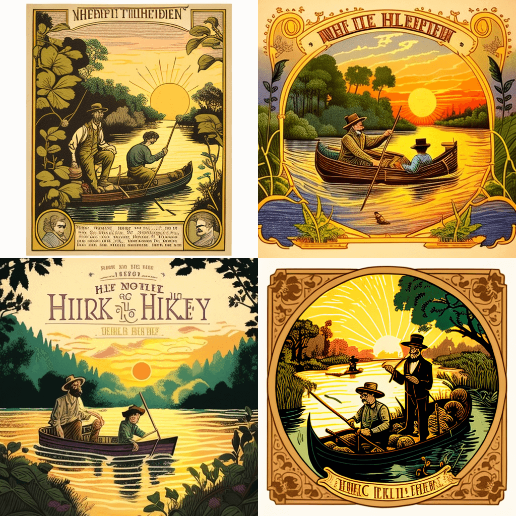 “The Adventures of Huckleberry Finn” – A colorful and whimsical illustration depicts Huck and Jim rafting down the Mississippi River, surrounded by lush greenery and wildlife. The sun is setting in the background, casting a warm golden light over the scene. Huck is seen sitting with his fishing pole while Jim steers the raft with a long stick. (From Mark Twain’s “Adventures of Huckleberry Finn”) "허클베리 핀의 모험" – 헉과 짐이 무성한 녹지와 야생 동물로 둘러싸인 미시시피 강에서 래프팅을 하는 모습을 다채롭고 기발한 그림으로 묘사합니다. 배경에는 태양이 지고 있어 장면 위에 따뜻한 황금빛 빛을 드리우고 있습니다. Huck은 낚싯대를 들고 앉아 있고 Jim은 긴 막대기로 뗏목을 조종합니다. (마크 트웨인의 '허클베리 핀의 모험' 중에서)