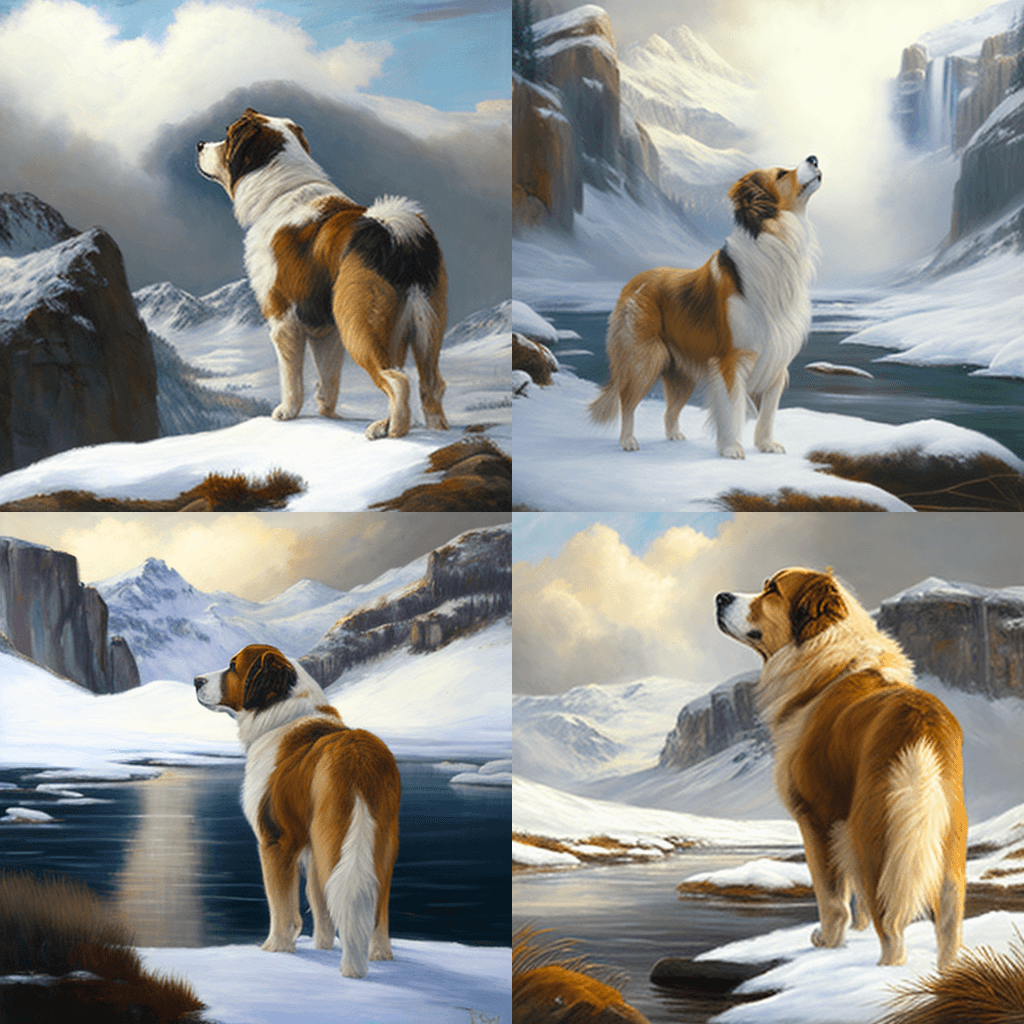“The Call of the Wild” – A dramatic oil painting captures Buck, the St. Bernard-Scotch Collie mix, in the middle of a snowy wilderness, surrounded by towering mountains and ice floes. Buck is standing tall, with his head held high, looking out into the distance, as if he is answering the call of the wild. The painting is set against a vivid blue sky, with the sun shining down, creating a sense of awe and majesty. (From Jack London’s “The Call of the Wild”) “야생의 부름(The Call of the Wild)” – 우뚝 솟은 산과 유빙으로 둘러싸인 눈 덮인 황무지 한가운데에 있는 세인트 버나드-스카치 콜리 품종인 벅의 모습을 극적인 유화로 포착했습니다. 벅은 마치 야생의 부름에 응답하는 것처럼 고개를 높이 들고 멀리 내다보고 있습니다. 이 그림은 선명한 푸른 하늘을 배경으로 하고 있으며 태양이 빛나고 있어 경외감과 장엄함을 자아냅니다. (잭 런던의 '야생의 부름' 중에서)