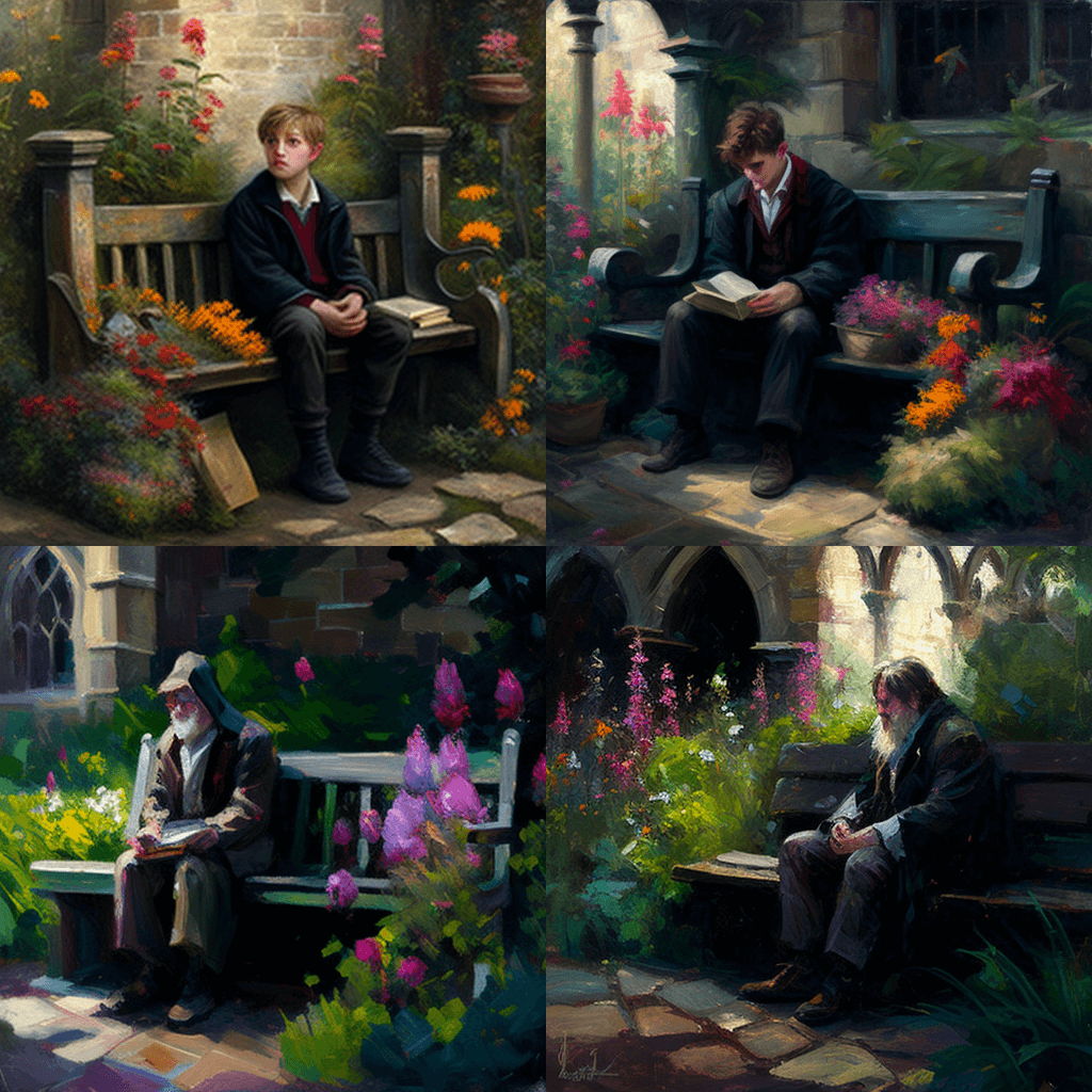“A Moment of Solitude in Hogwarts School of Witchcraft and Wizardry” – In the style of a classic oil painting, a portrait of a young wizard sits quietly on a bench in the Hogwarts castle gardens, surrounded by vibrant flowers, a hidden nook. A copy of “One Thousand Magical Herbs and Fungi” lies open on the bench beside him. (From J.K. Rowling’s “Harry Potter and the Philosopher’s Stone”) "호그와트 마법학교에서의 고독의 순간" - 고전 유화 스타일로, 젊은 마법사의 초상화가 호그와트 성 정원 벤치에 조용히 앉아 있고, 숨겨진 구석인 생기 넘치는 꽃으로 둘러싸여 있습니다. 그의 옆 벤치에는 "1000가지 마법의 약초와 곰팡이"라는 책이 펼쳐져 있습니다. (J.K.롤링의 '해리포터와 마법사의 돌' 중에서)