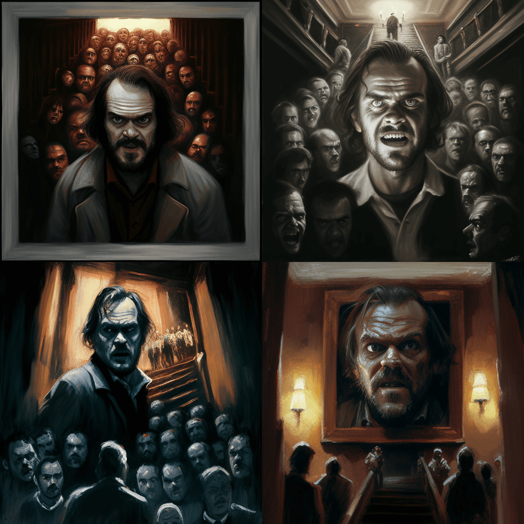 “In the style of a dramatic, dark oil painting, show a scene from Stephen King’s “The Shining” where Jack Torrance is slowly losing his mind in the Overlook Hotel. Show him standing at the top of a staircase, with the ghostly visions of the past residents surrounding him and a sense of madness in his eyes.” “극적이고 어두운 유화 스타일로 오버룩 호텔에서 잭 토런스가 서서히 정신을 잃어가고 있는 스티븐 킹의 “샤이닝”의 한 장면을 보여주세요. 계단 꼭대기에 서 있는 모습을 보여주세요. 과거 주민들이 그를 둘러싸고 있는 유령 같은 환영과 그의 눈에는 광기가 담겨 있습니다.”