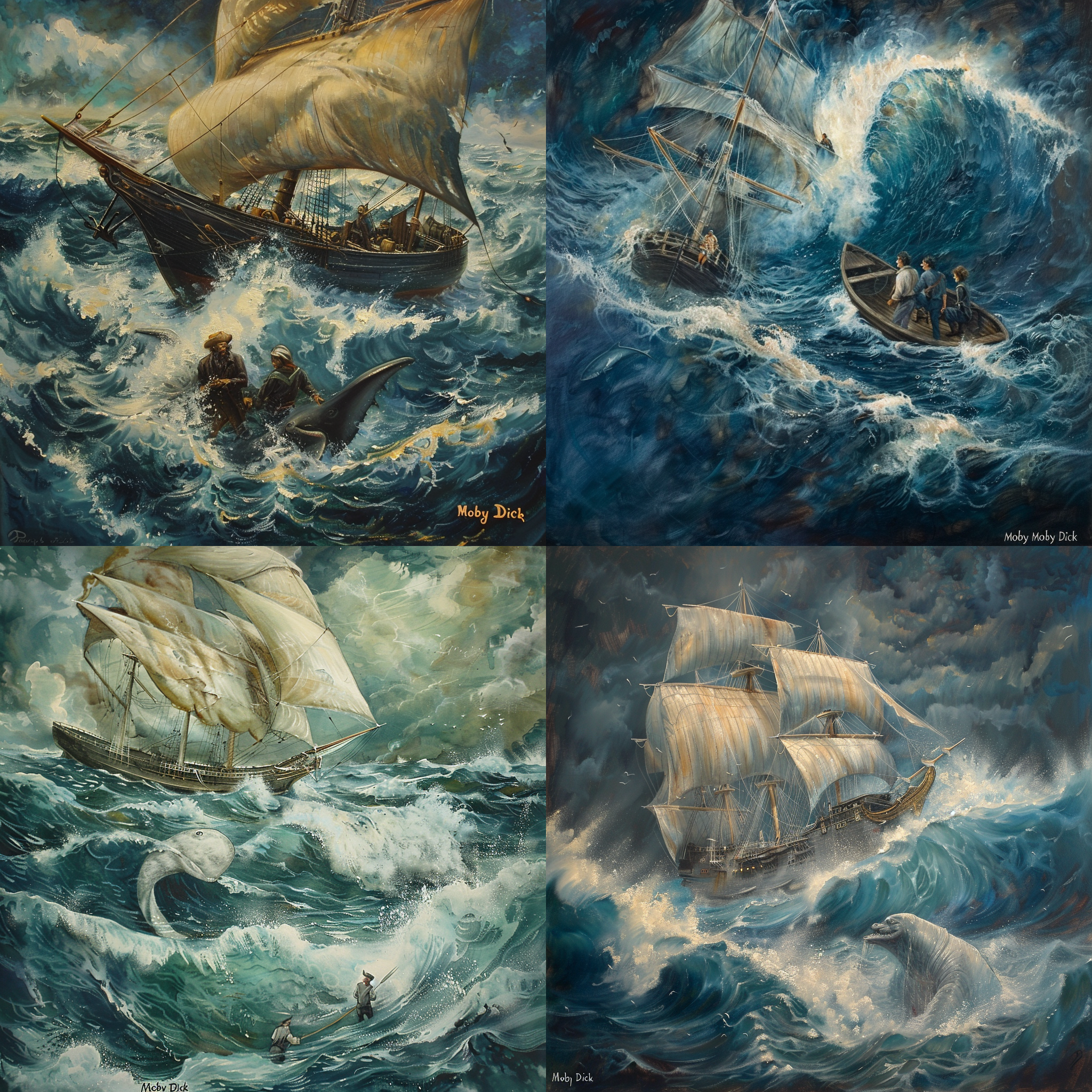 “Moby Dick” by Herman Melville – A romantic painting of Ishmael and Queequeg aboard the Pequod, surrounded by the rolling waves of the sea. 허먼 멜빌(Herman Melville)의 “모비딕(Moby Dick)” – 출렁이는 바다의 파도에 둘러싸인 피쿼드호에 탑승한 이스마엘과 퀴퀘그의 낭만적인 그림입니다.