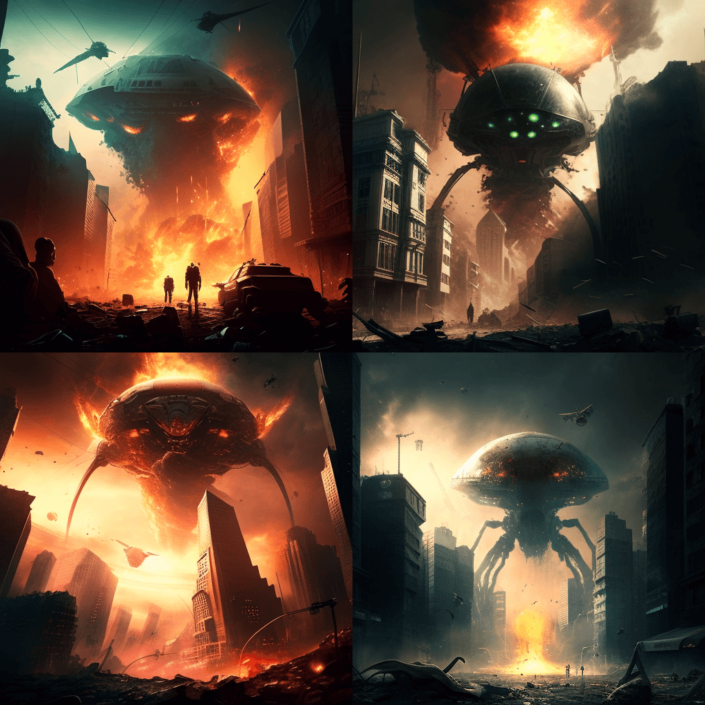 “The War of the Worlds” – A science fiction-style alien invasion with dramatic lighting, science fiction robots and massive potholes, deserted apocalypse street, glooming lighting, human survivors hiding under the rubble. “세계 전쟁” – 드라마틱한 조명, SF 로봇, 거대한 움푹 들어간 곳, 황량한 종말의 거리, 어두운 조명, 잔해 밑에 숨어 있는 인간 생존자들이 등장하는 SF 스타일의 외계인 침공입니다.