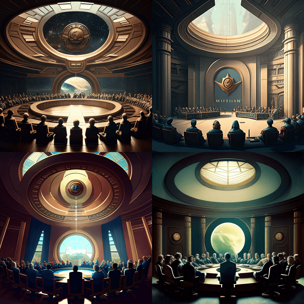 “반딧불 스타일로”: 우주 개척의 확장 - 2100년, 인류는 은하계의 먼 곳까지 퍼져나갔습니다. 다양한 외계종과 문화가 공존하는 분주한 우주항의 풍경. - “In the Style of Star Trek”: The Founding of the United Federation of Planets – In 2110, a coalition of planets has formed, creating a peaceful and prosperous federation. A scene of a grand council meeting, with delegates from different worlds gathered.