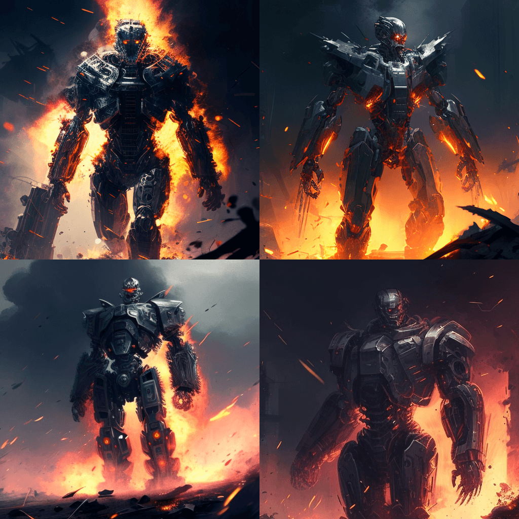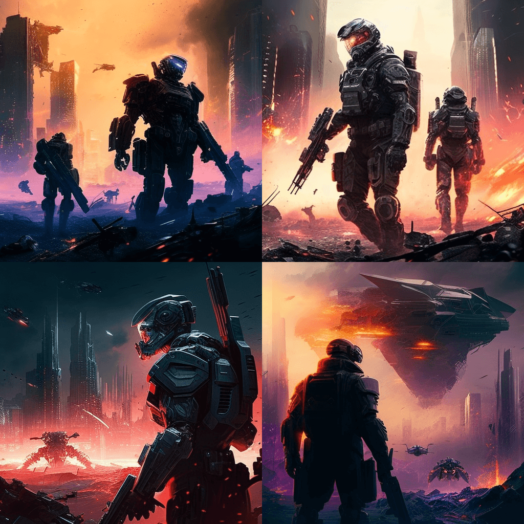 "블레이드 러너 스타일": 로봇의 부상 - 2053년, 로봇은 이전에 인간이 하던 많은 일을 대신하게 되었습니다. 첨단 로봇과 드론으로 가득 찬 분주한 거리의 풍경과 몇 명의 작업자가 흩어져 있습니다. - “In the Style of The Terminator”: The First Interstellar War – It’s 2065, and humanity is locked in a brutal conflict with an alien race. A battle scene with soldiers and advanced weapons, with a futuristic city in the background.